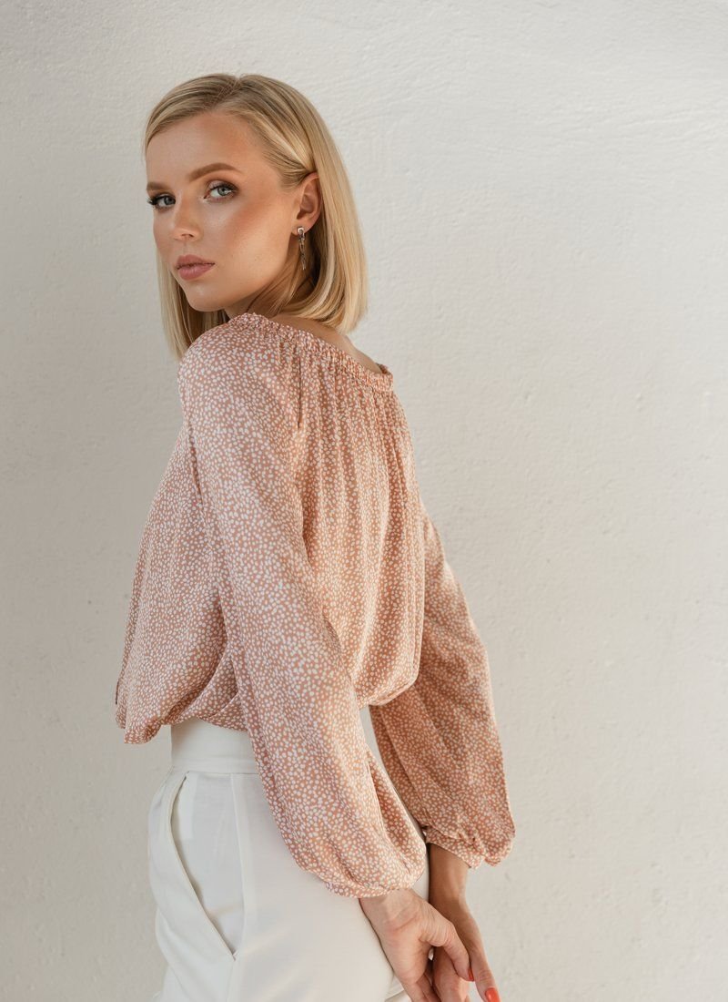 Beige silk blouse with small white polka dots, with a boat neck and an elastic insert on the back. Buttons on the front, long loose sleeve with thin cuffs.