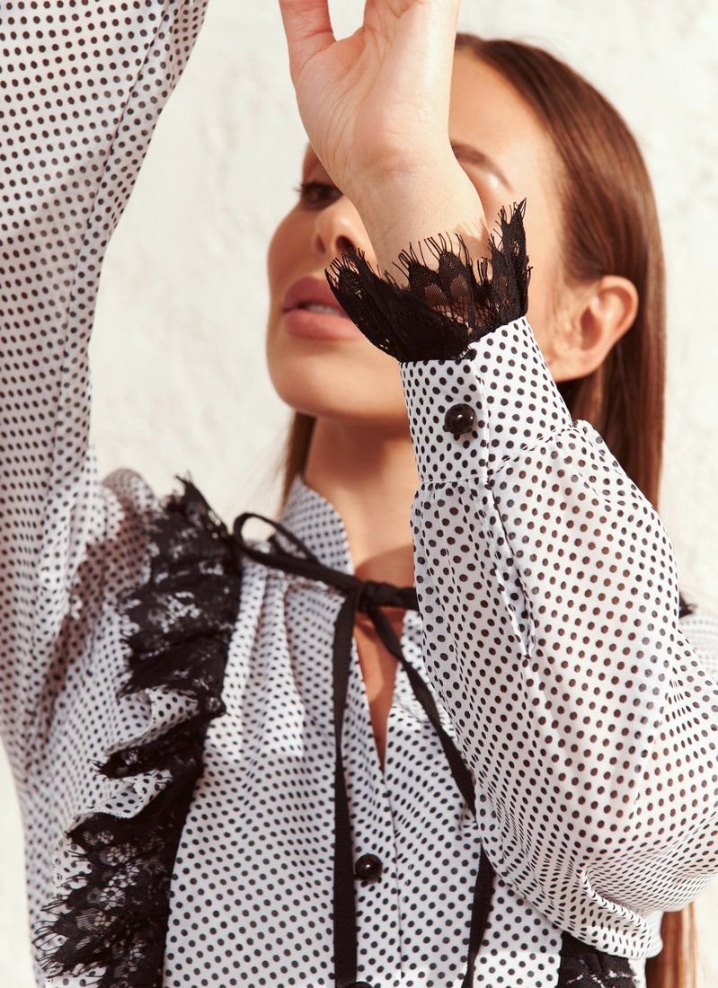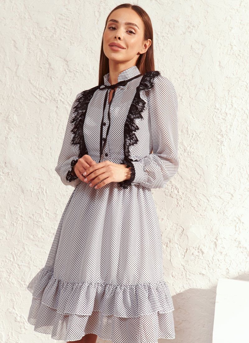 In the design of the mini-dress, special attention was paid to the feminine silhouette. The flared hem with flounces was complemented with a bodice with two-layer vertical ruffles and a decorative button closure. The neckline area is formed by a stand-up collar. For sewing the model, a light dense chiffon in small peas was used – a universal print according to Vogue.