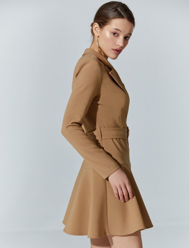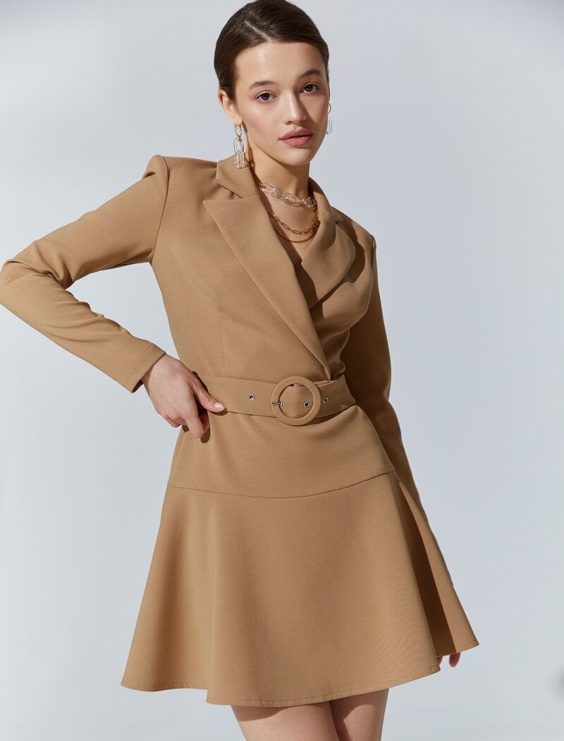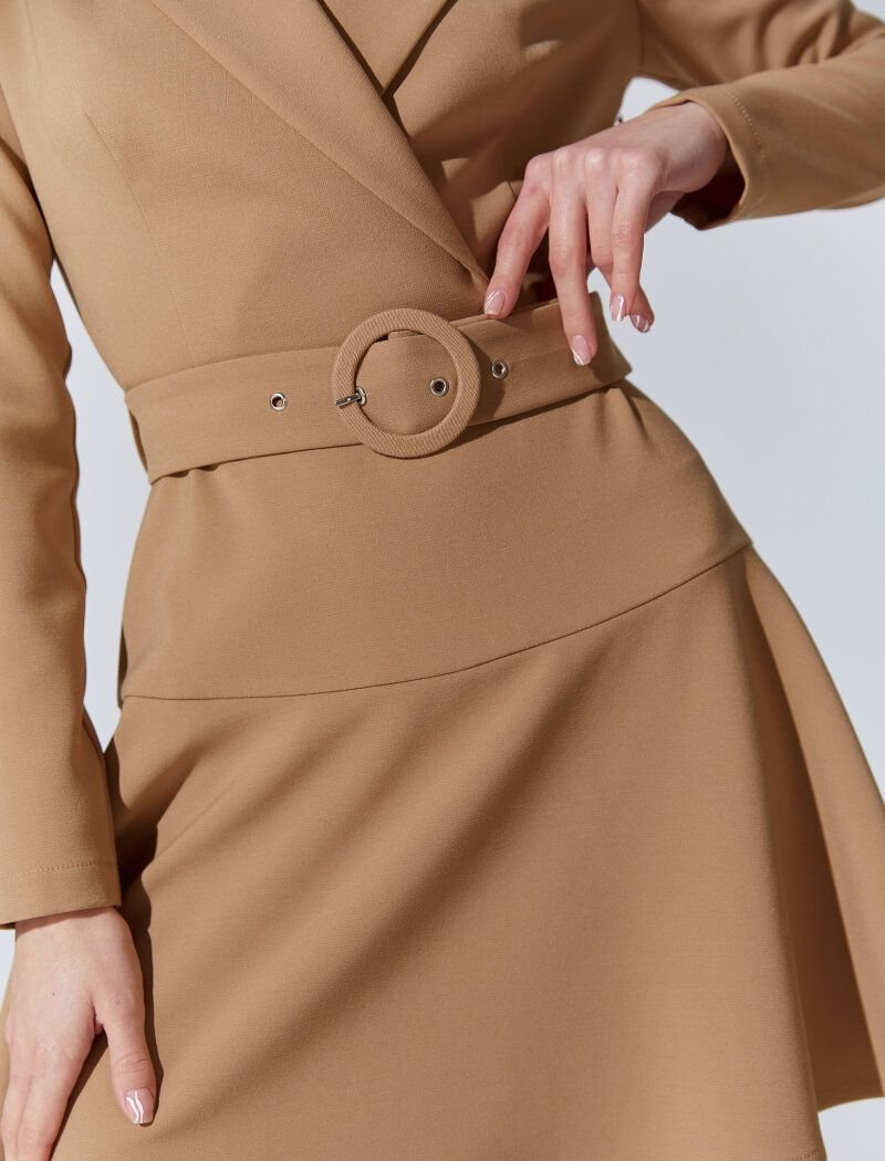 Due to the turn-down collar with lapels, the beige dress looks quite restrained and concise, without losing its femininity. The fitted model of the mini length emphasizes all the advantages of the figure. The V-shaped neckline visually slims. The set includes a removable belt with a round buckle.
