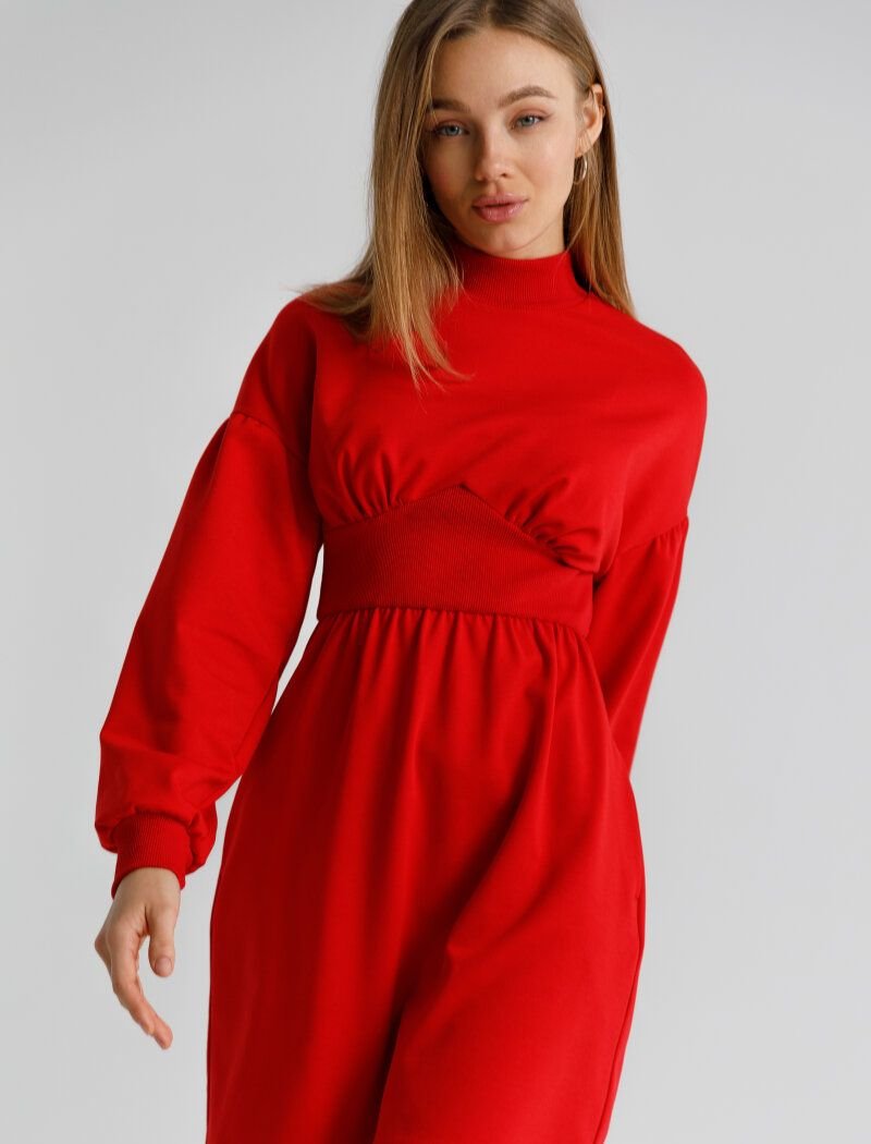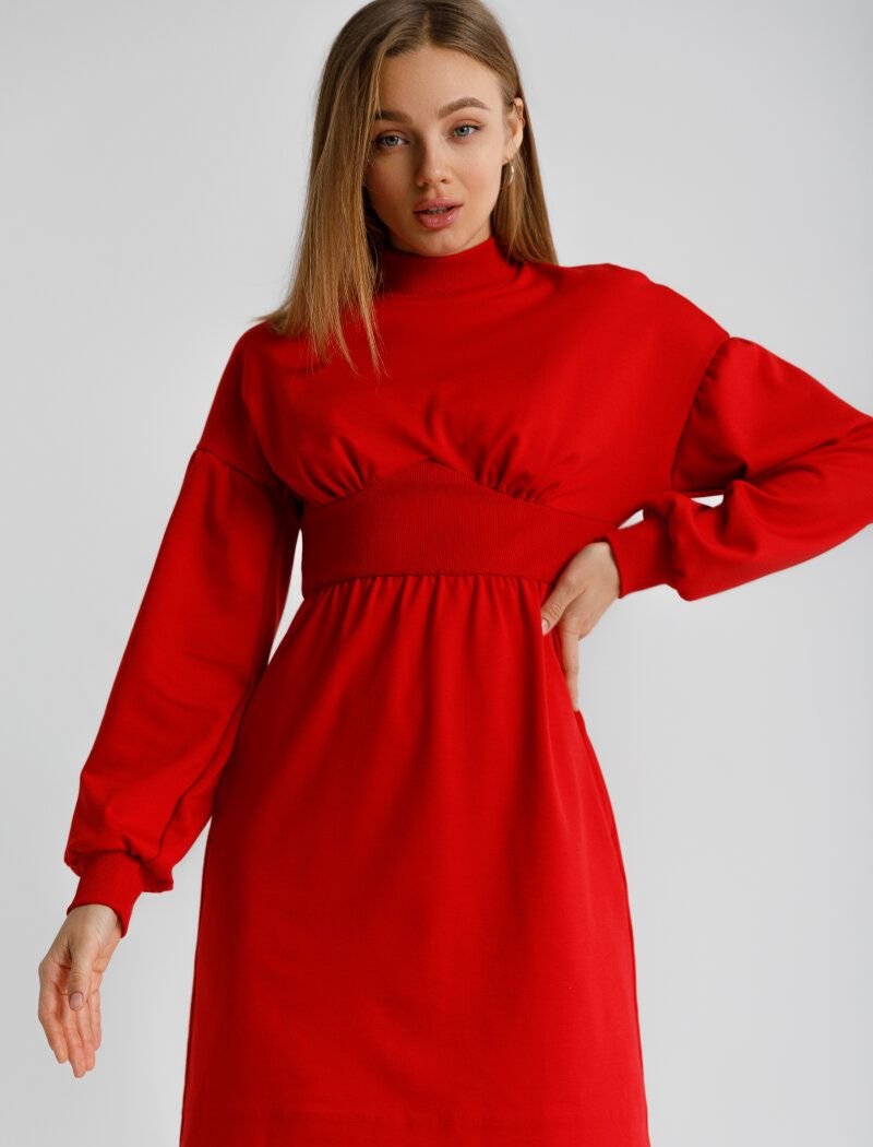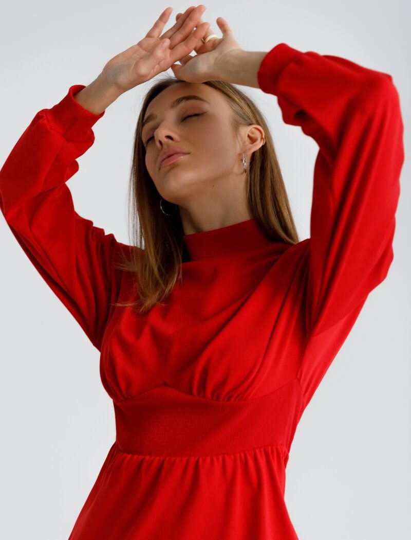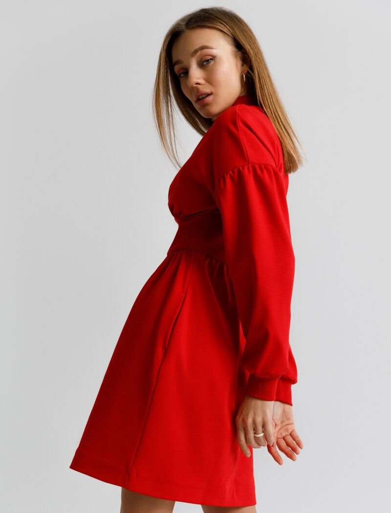 The mini dress of bright red color is made of soft knitwear. The model of a tight-fitting cut is complemented by an accent sew-in belt, pleats on the bodice and voluminous sleeves in the spirit of the SS20 Miu Miu and Valentino shows.