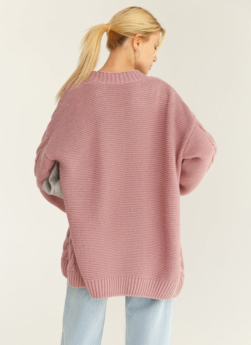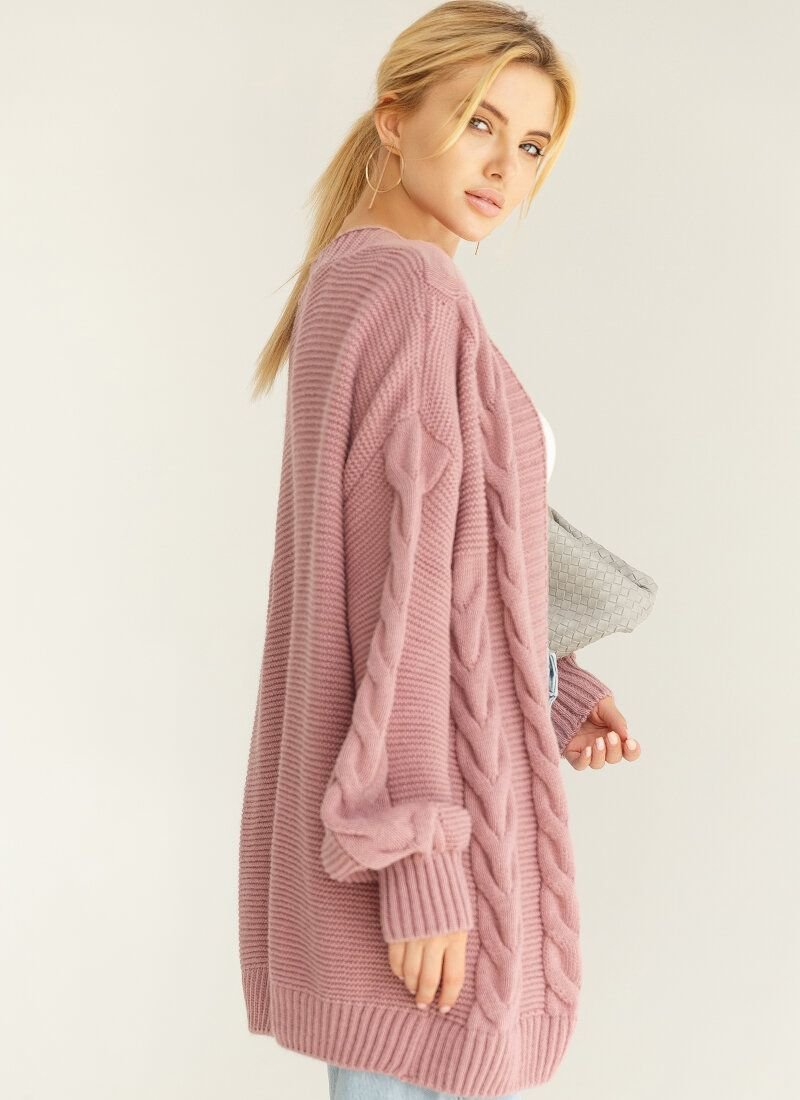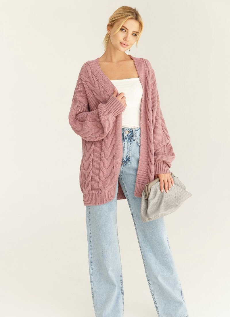 A knitted cardigan with voluminous braids will become an indispensable element of the basic wardrobe. The powdery shade is combined with any things, and the loose cut is suitable for any type of figure. Large knitting adds texture to the model.