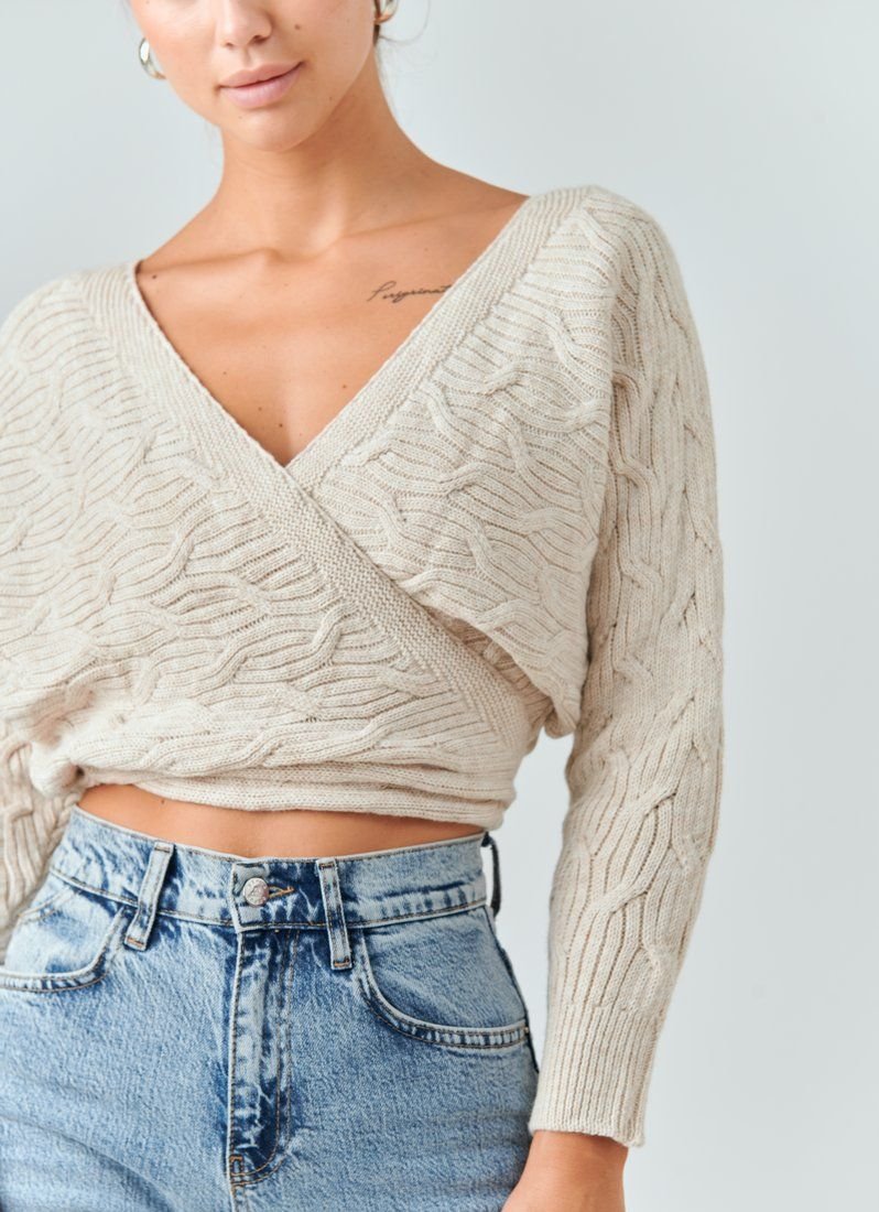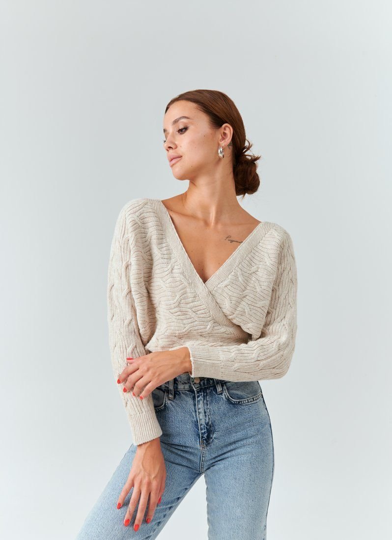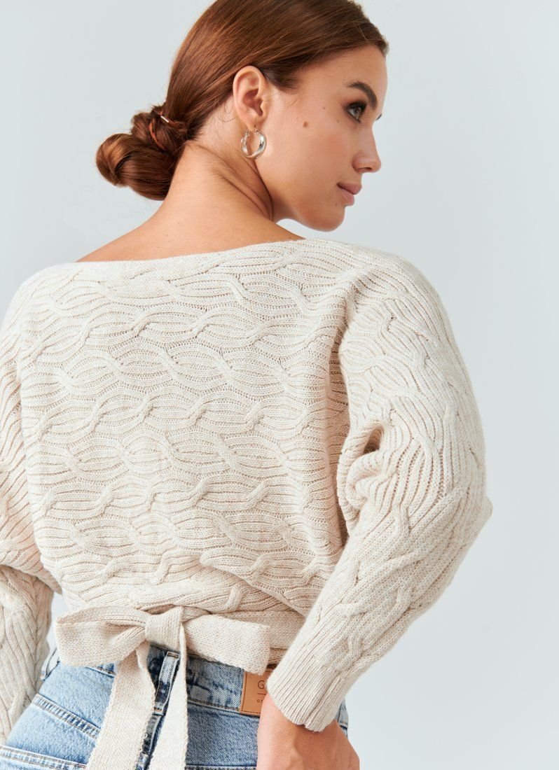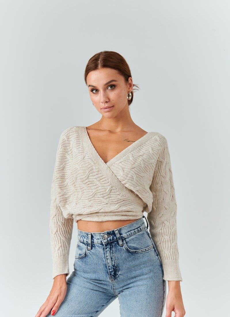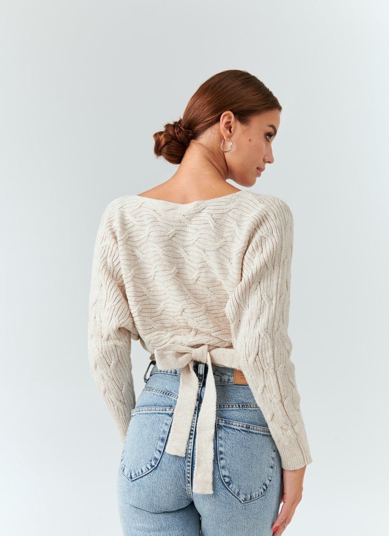 A cropped knitted jumper for the smell of a basic beige color. V-neck on the chest, which can be adjusted, loose sleeve and long ties to match. The main decoration of the jumper was curly knitting. The model is ideal for both images with jeans and classic trousers.