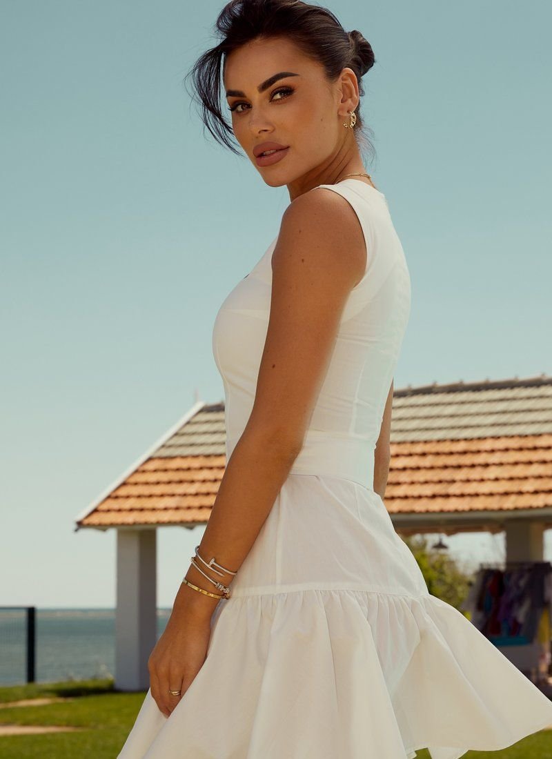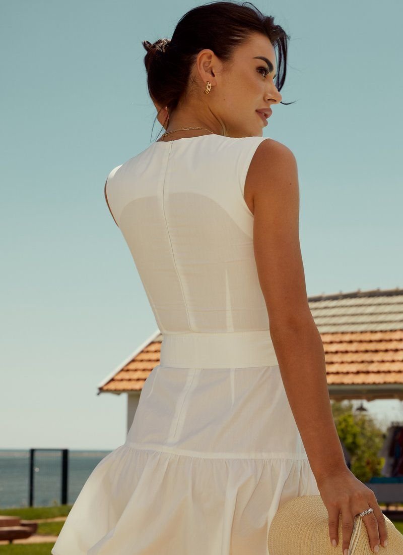 Universal white dress made of natural cotton fabric. An original cutout on the chest, a fitted cut, a short flared skirt and a wide belt with a buckle, which can be fastened in loops for maximum convenience.