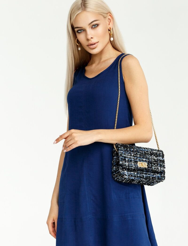 A restrained dress of a classic a-silhouette in dark blue color. Two patch round pockets on the sides.