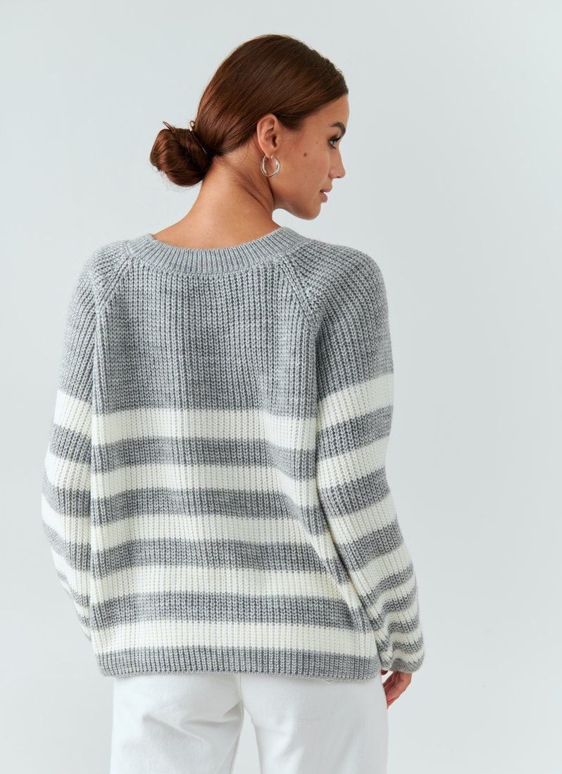 Oversize gray sweater with a wide stripe. The product is made of a pleasant knitted knit and will keep you warm in the cool autumn and winter.