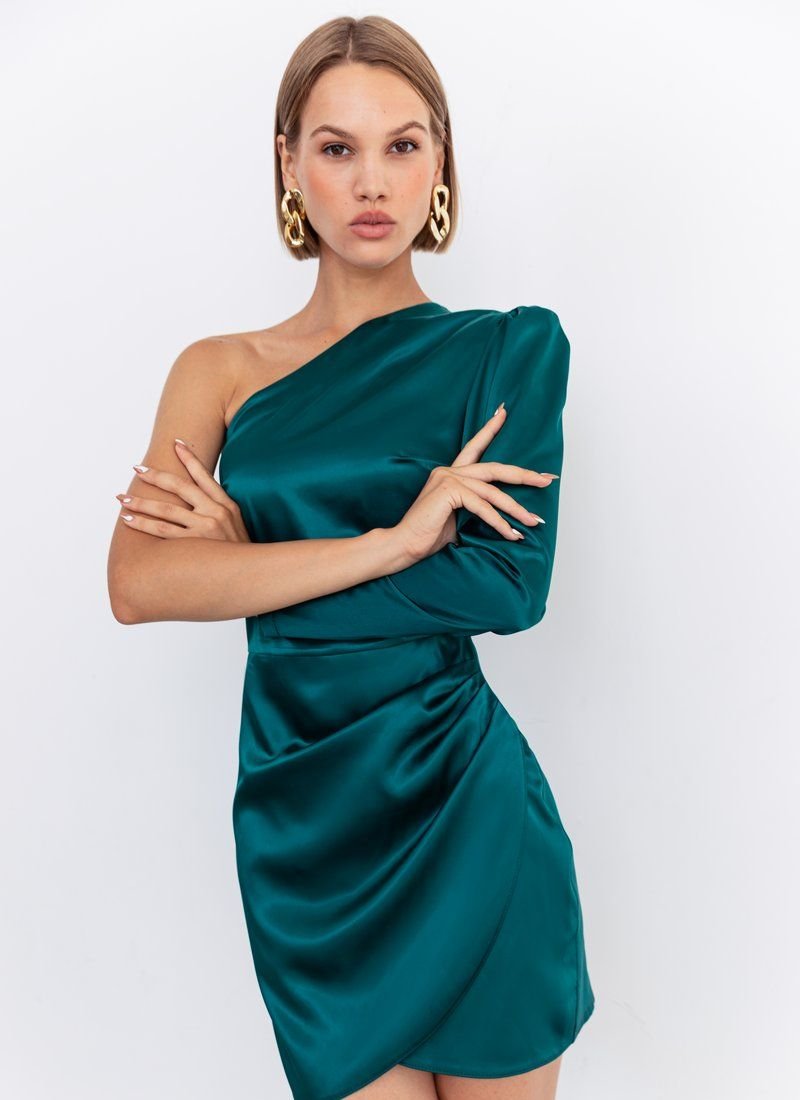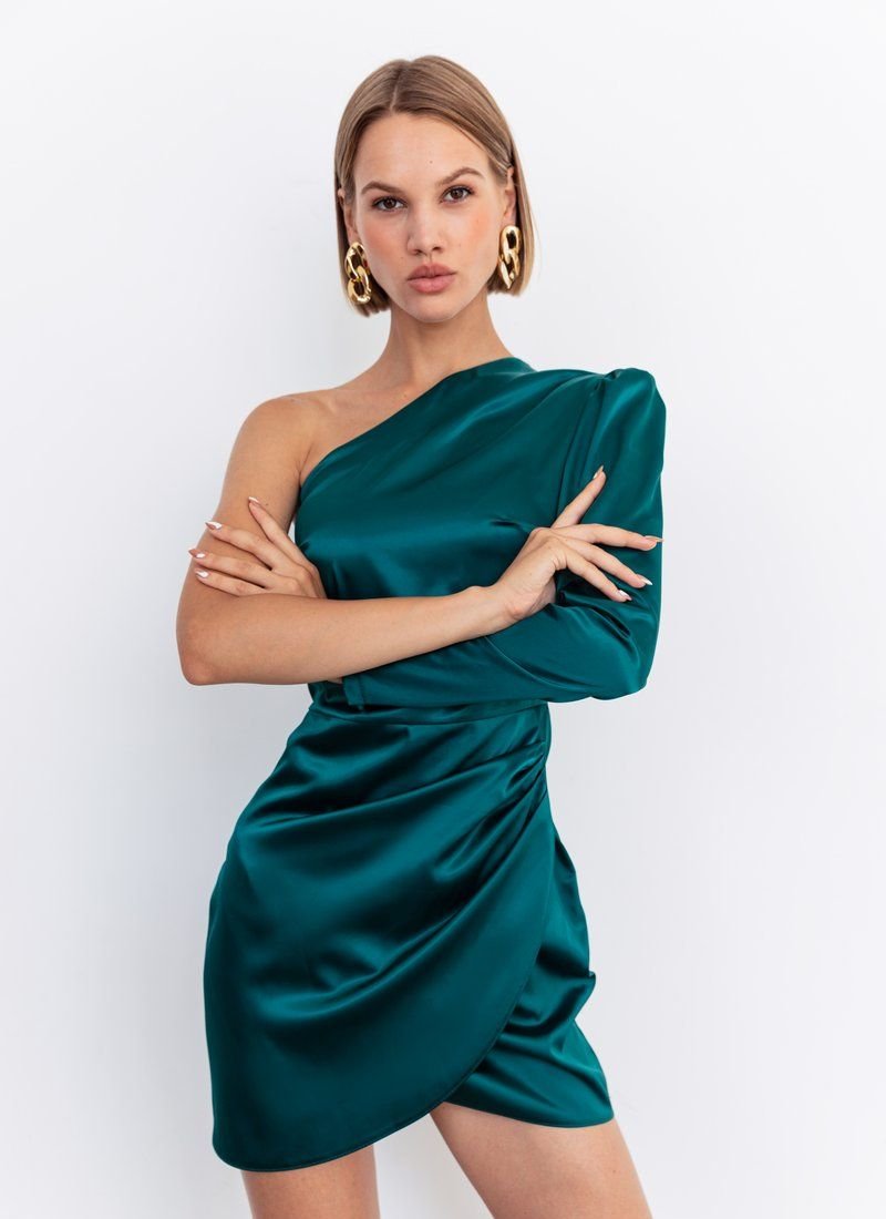 Satin mini dress in a beautiful emerald color. An open shoulder on one side adds femininity to the image. The skirt is decorated with an assembly, which makes an additional emphasis on the waist.