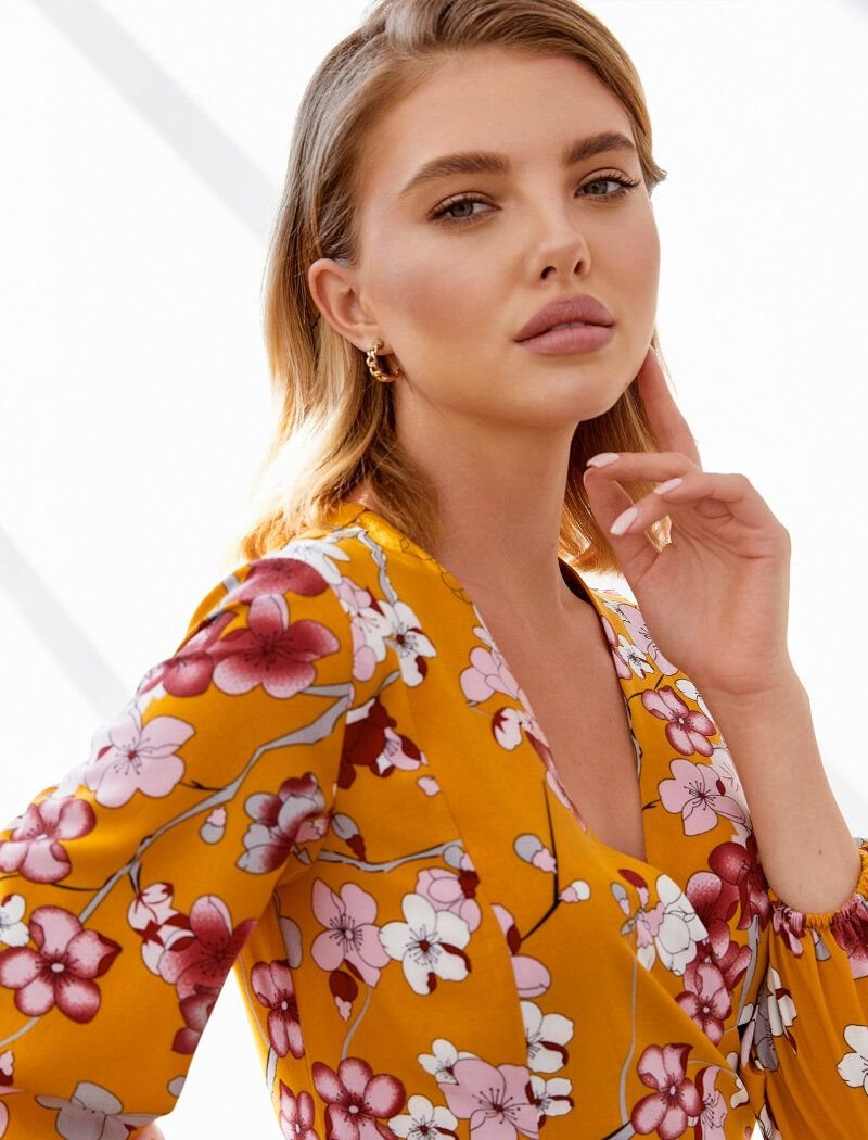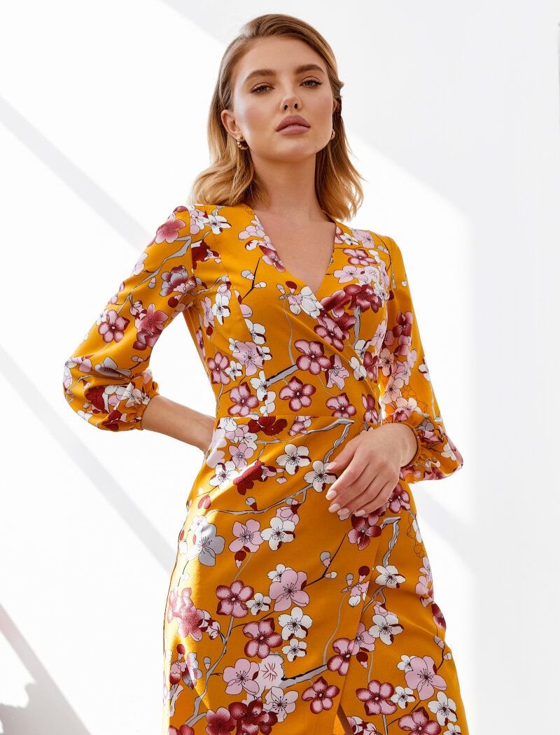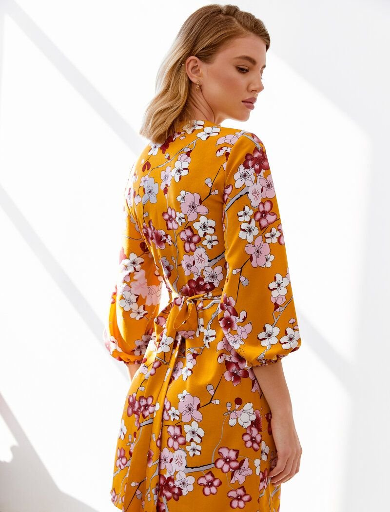 Floral print does not look banal, especially in spring. A dress with a large contrasting motif forms a feminine silhouette, due to the cut on the smell. The length of the mini and the side cut favorably emphasize the legs. Sleeves ? they are complemented by elastic cuffs.