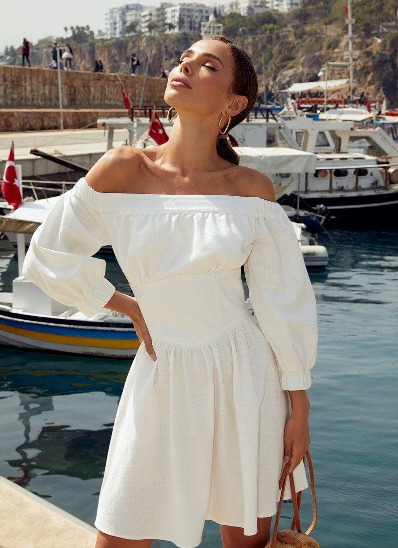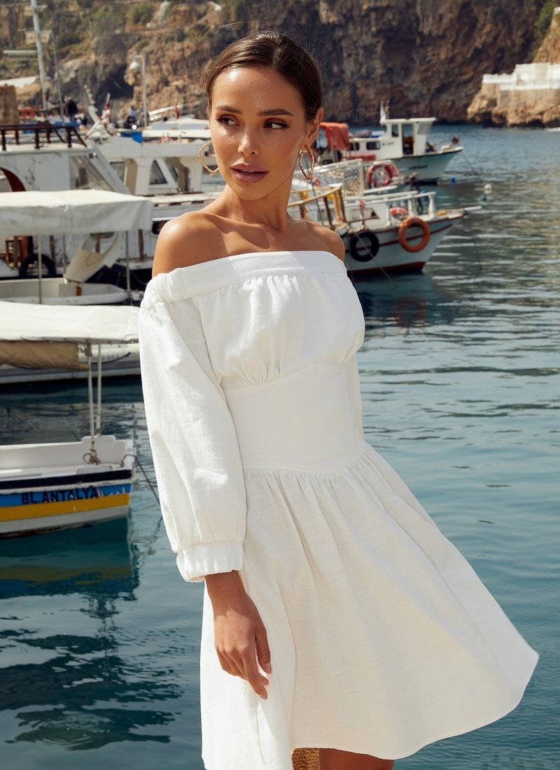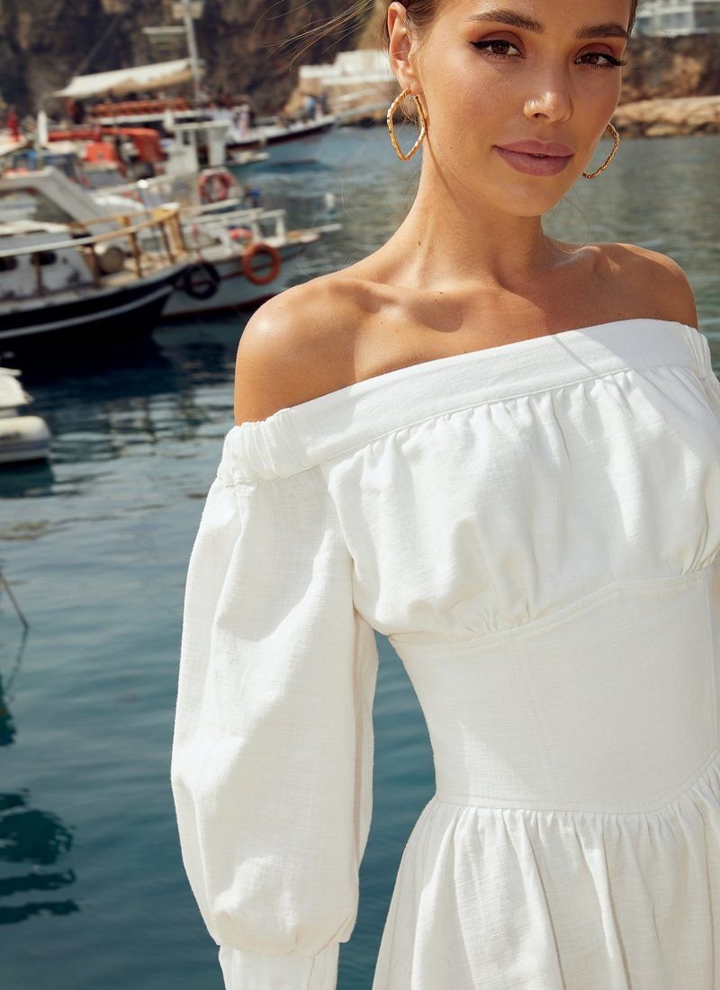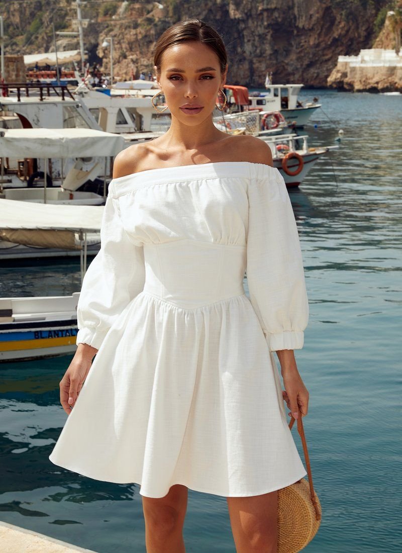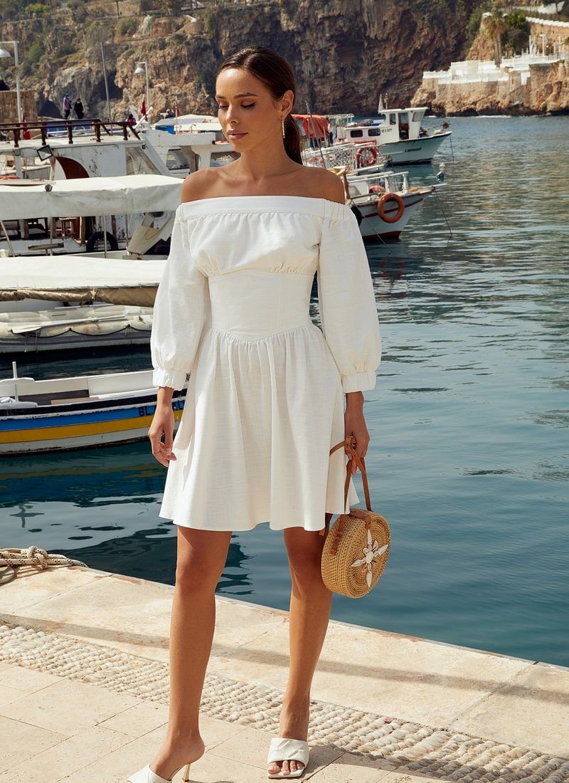 In the case of the white mini dress, Gepur designers combined femininity and comfort. The light cotton material is responsible for the first aspect. And for the second - a wide waistband with a tie at the back, an open shoulder line and voluminous sleeves.