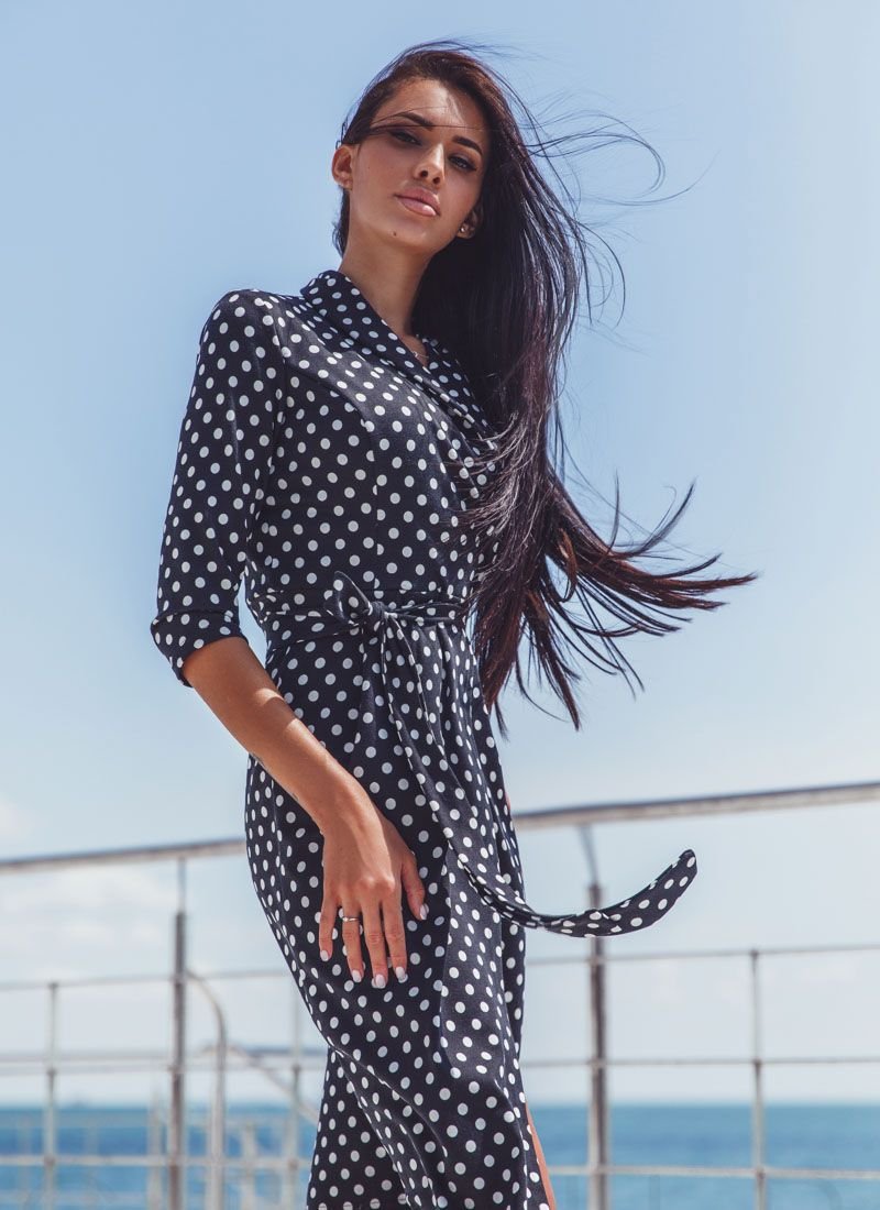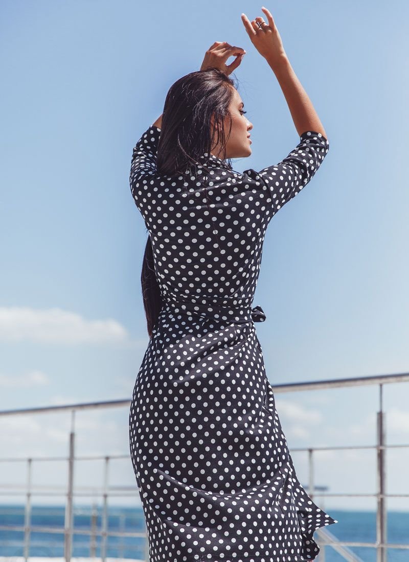 Plain midi dress with small polka dots for a fixed smell, with a shawl collar, long sleeves, a cut-off waist with a removable belt.
