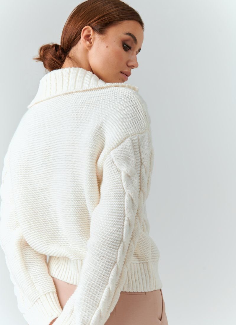 White wool jumper with buttons. The jumper is decorated with a knitted pigtail, as well as a large collar. This model can be worn as an independent thing, or over tops or shirts.