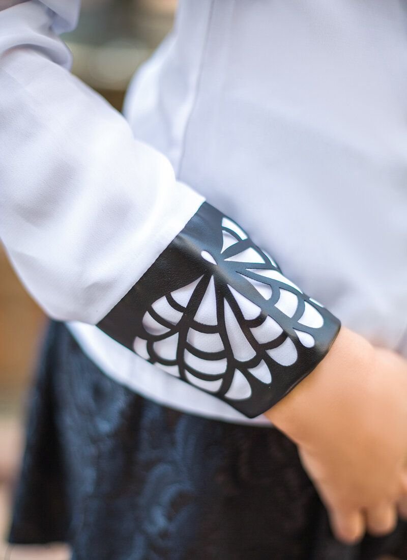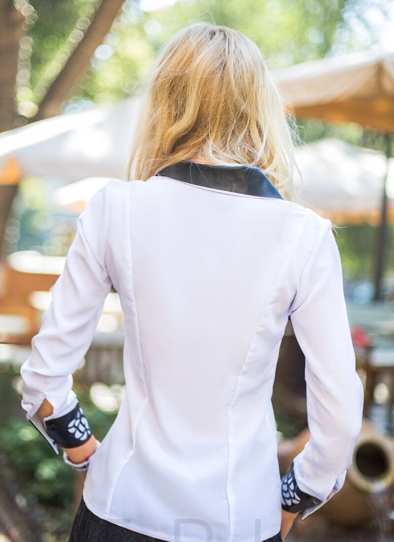 A fitted shirt of a classic cut with contrasting buttons, a strict collar and cuffs made of soft eco-leather with figured perforation.