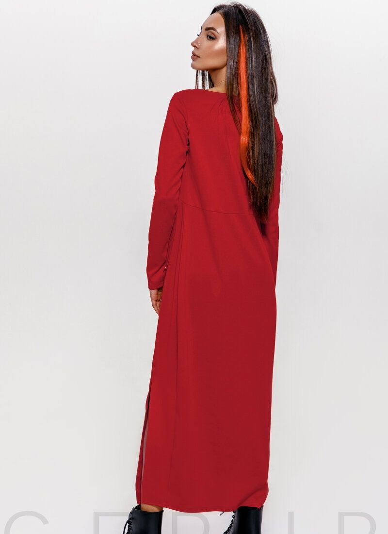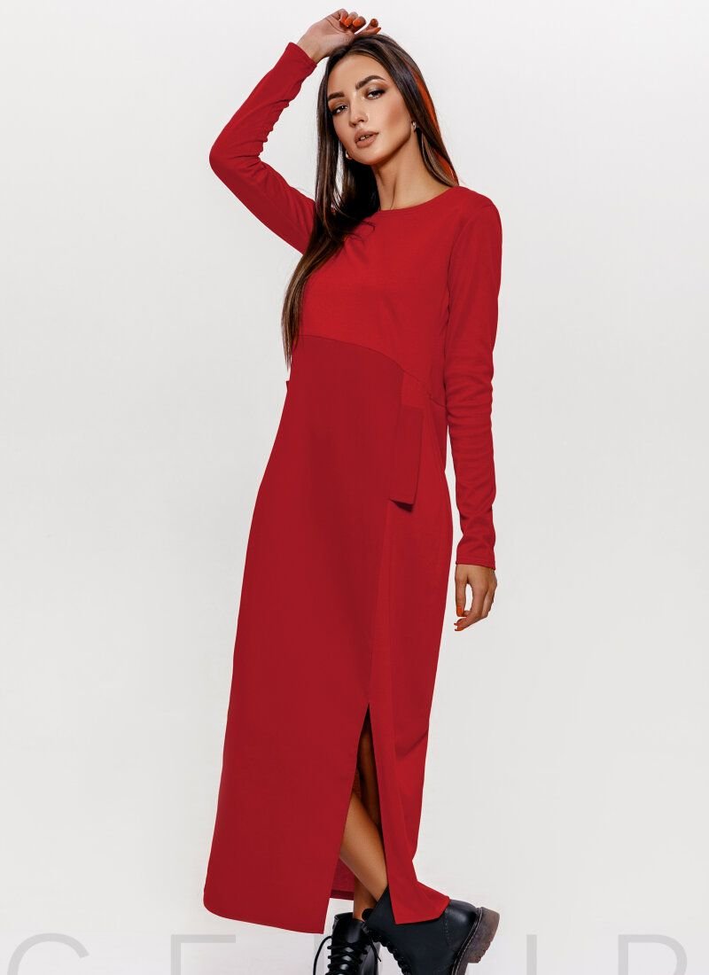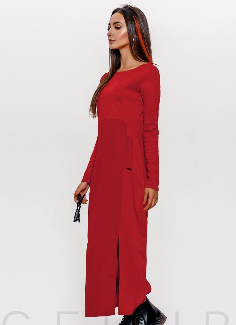 Red long dress: knitted top, round neck, long sleeve, high waistline, two welt pockets in the seams with a flap and a high slit on the side.