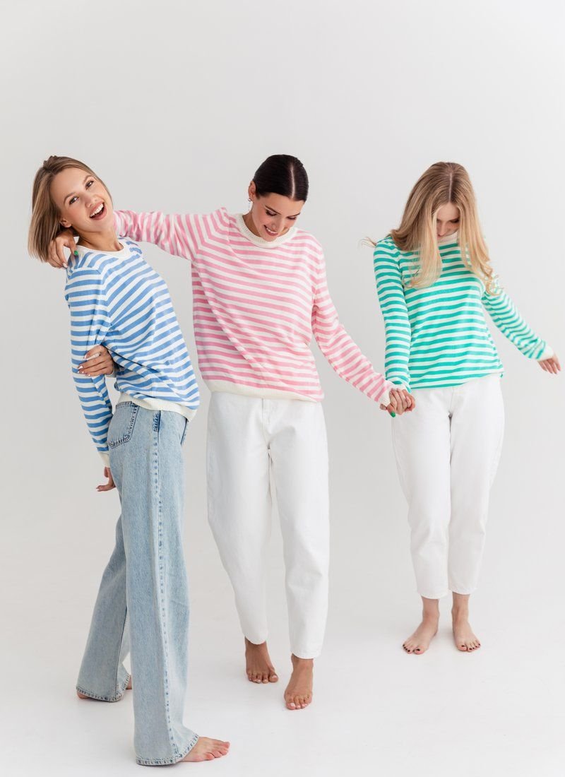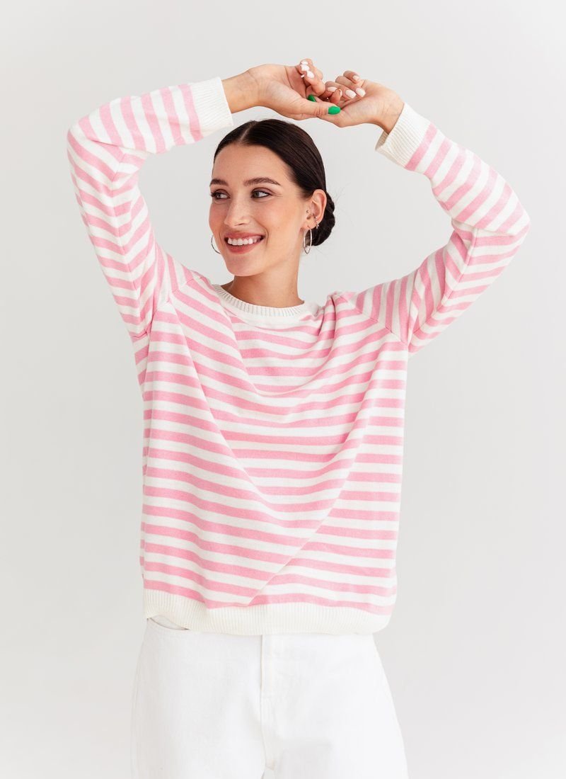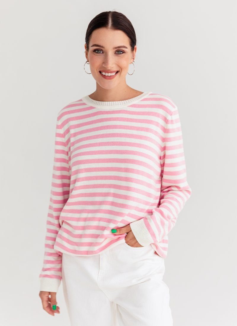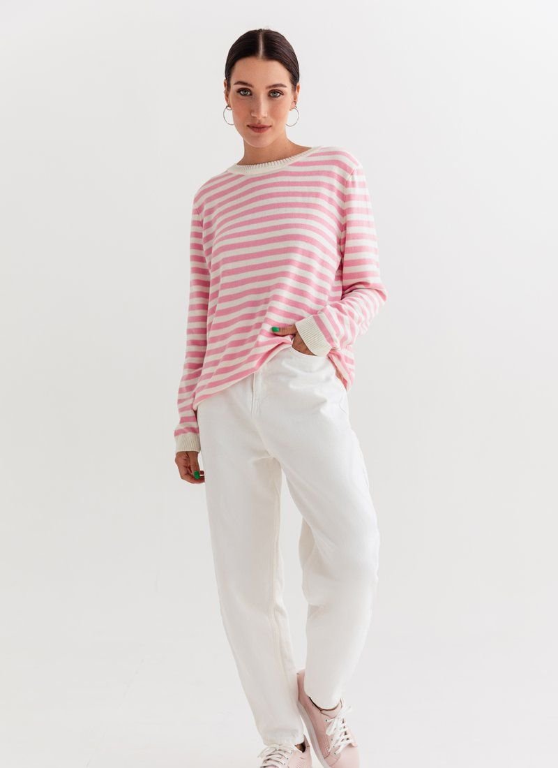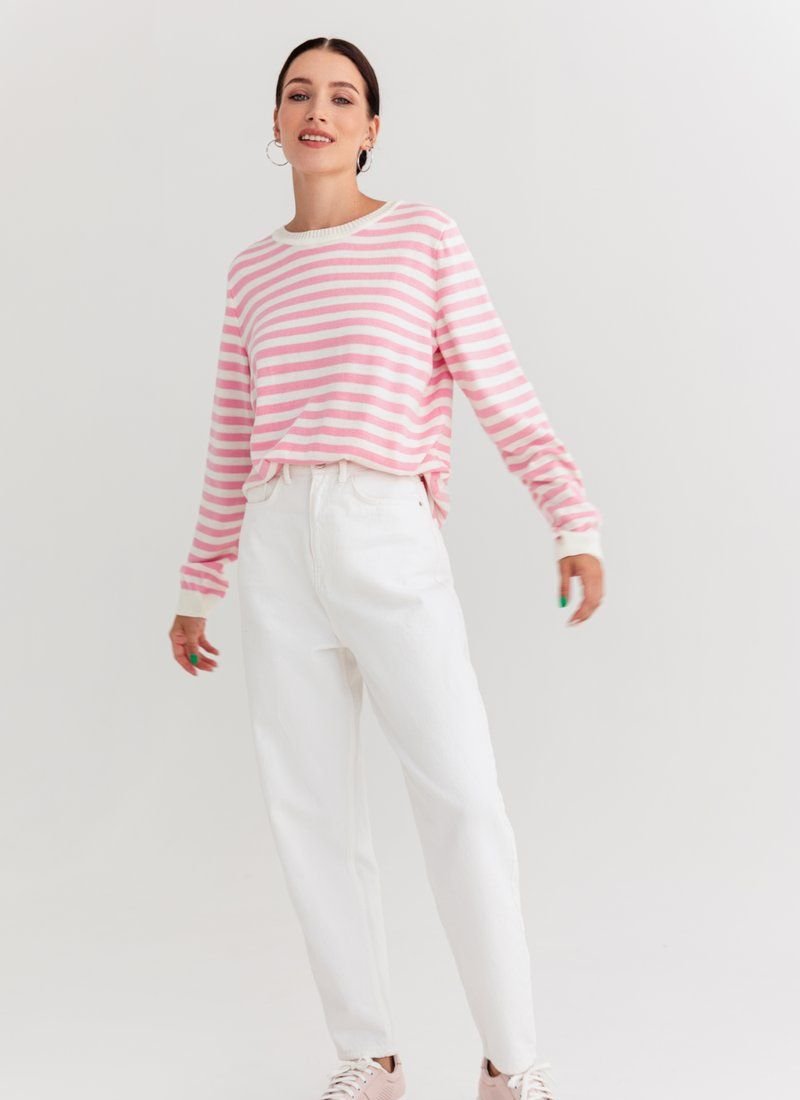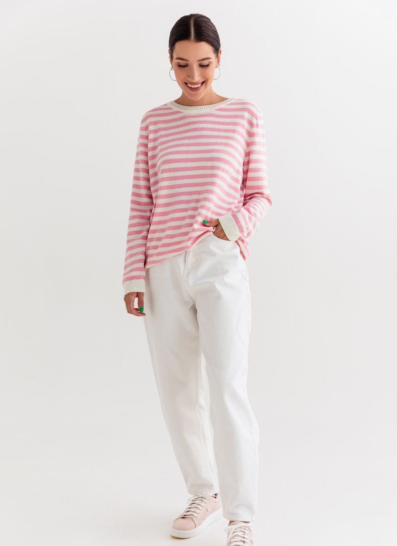 A marine-style jumper made of a pleasant jersey. The model is presented with a round neck and a long sleeve. It can be combined with trendy wide jeans or palazzo trousers.