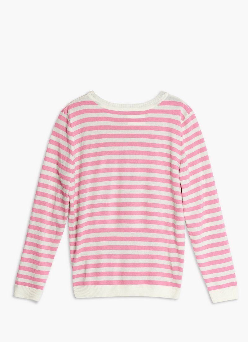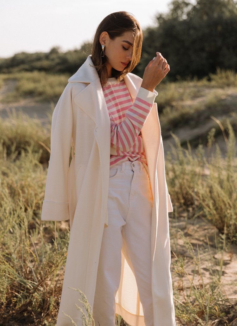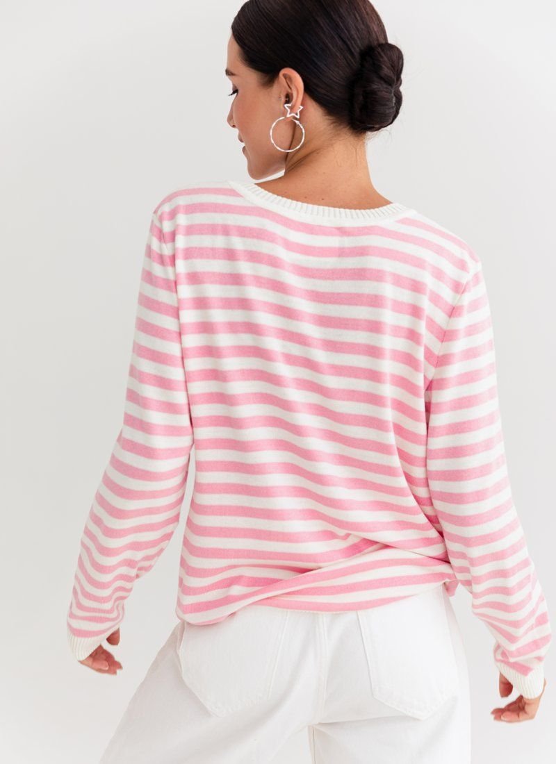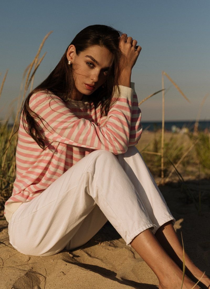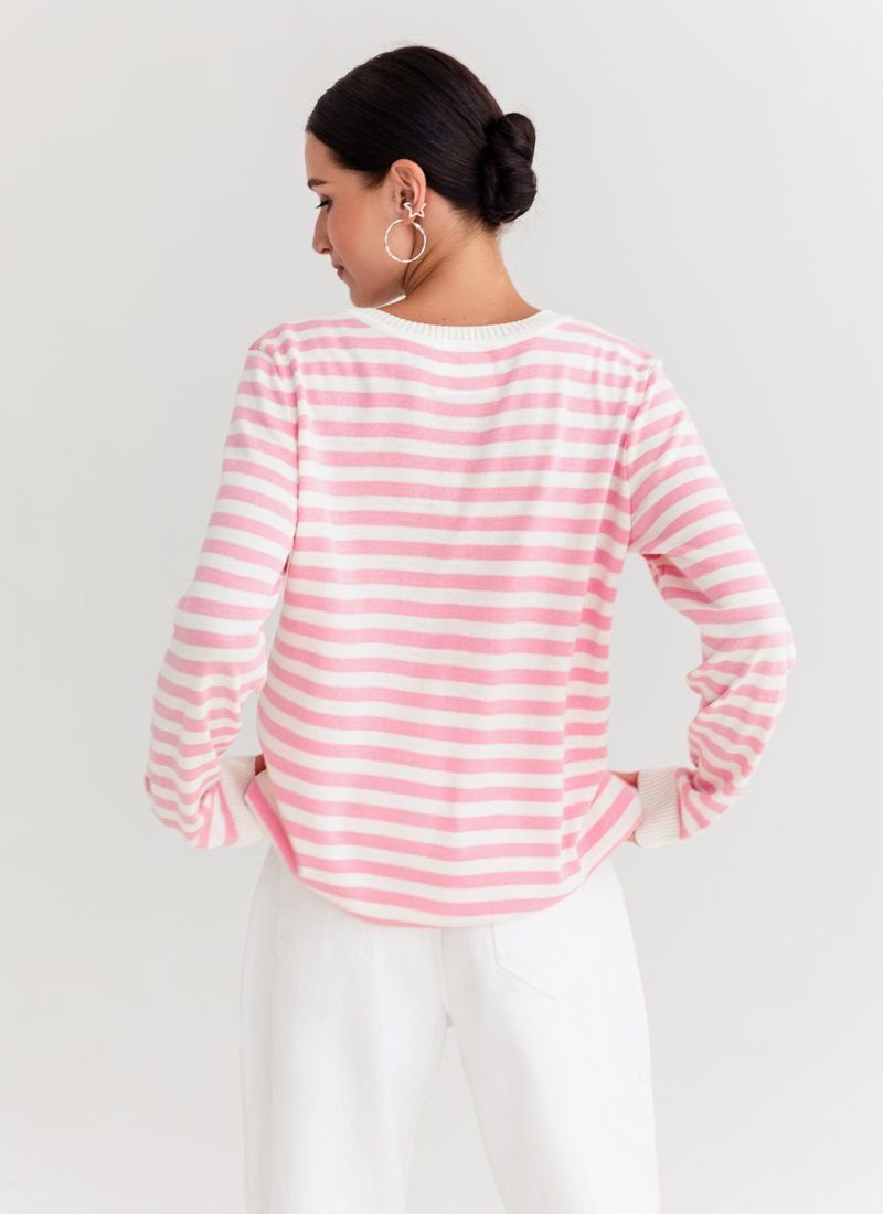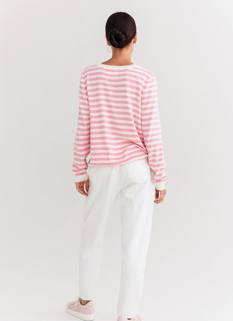 A marine-style jumper made of a pleasant jersey. The model is presented with a round neck and a long sleeve. It can be combined with trendy wide jeans or palazzo trousers.