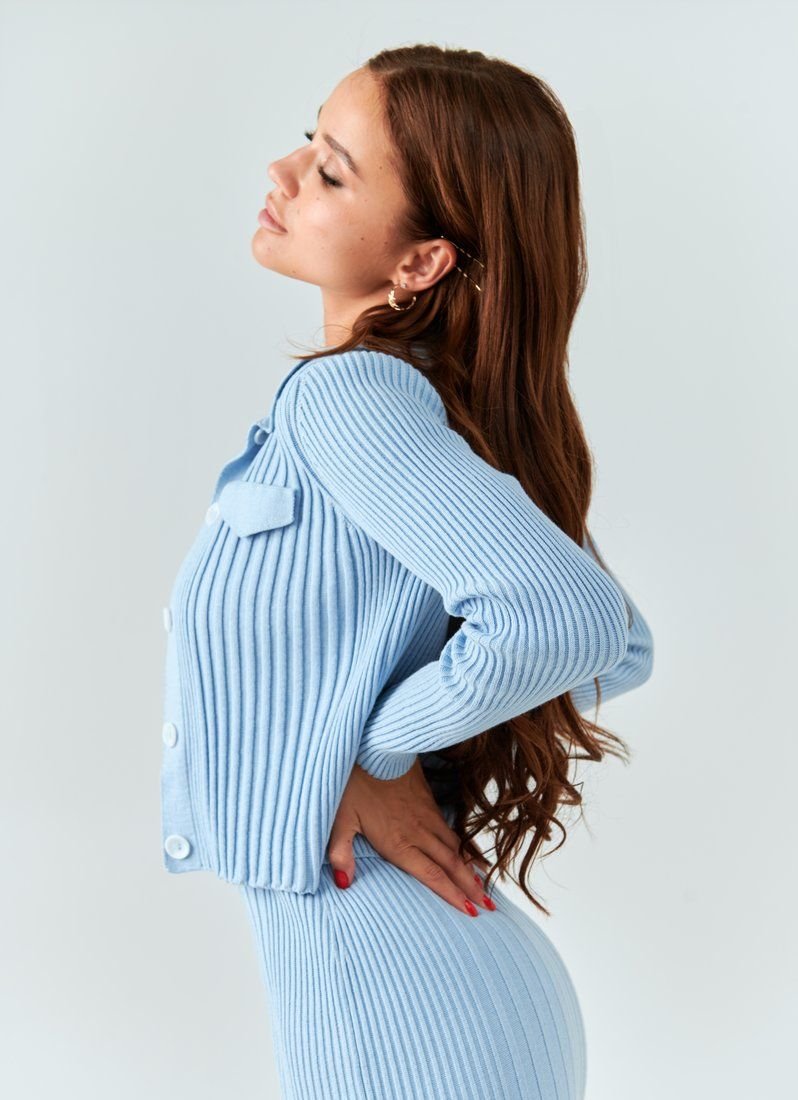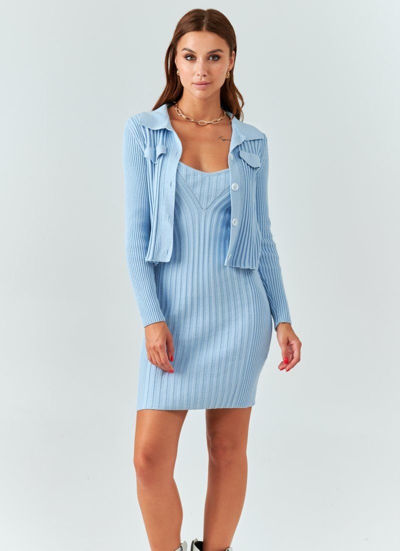 The actual set of knitted fabric in a rib. It includes a form-fitting dress with thin straps and a cardigan with a turn-down collar, chest pockets and textured buttons.