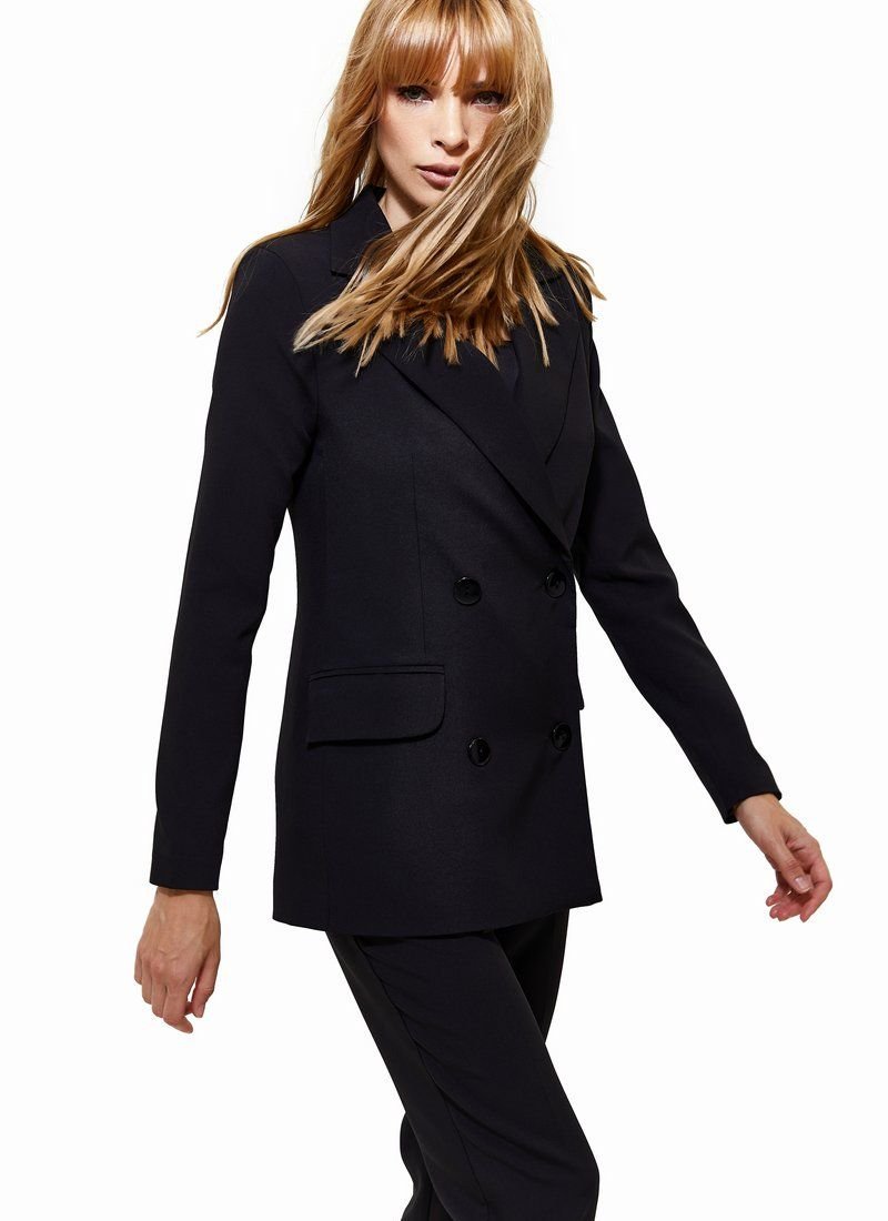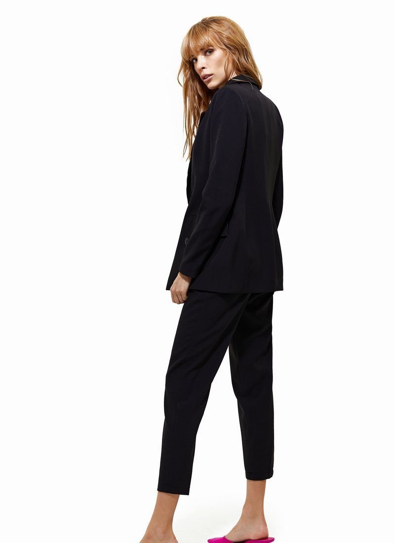 The pantsuit has already become a basic part of the wardrobe. We have a black model in front of us. Double-breasted lined jacket with inserts in the shoulders for a better shape, rectangular lapels, with pockets. High-waisted trousers with buttons and zippers, with pockets on the sides.