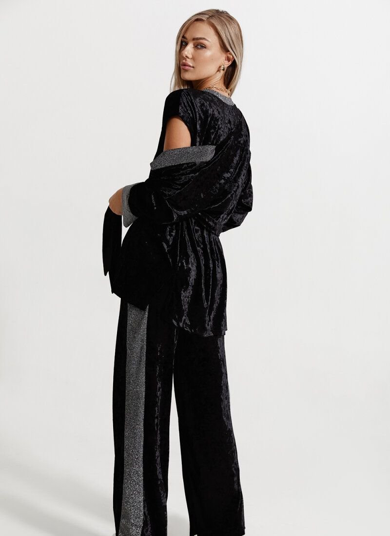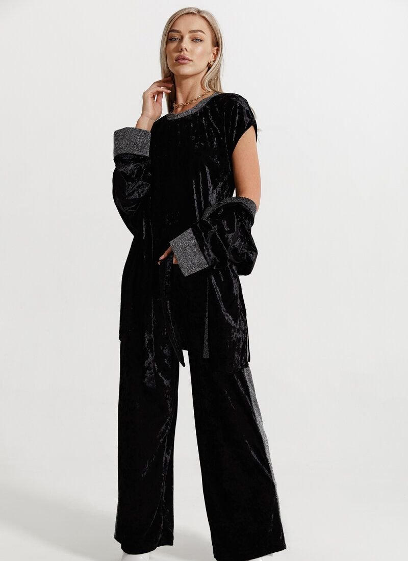 A set of flared trousers, a T-shirt and a loose cardigan is made of soft velvet material, which creates a stylish and comfortable image for the home. Neutral black color casts a cold shine due to the texture of the fabric. The neck of the T-shirt, the cuffs of the sleeves and the stripes on the trousers, made of shimmering lurex, act as a decor.