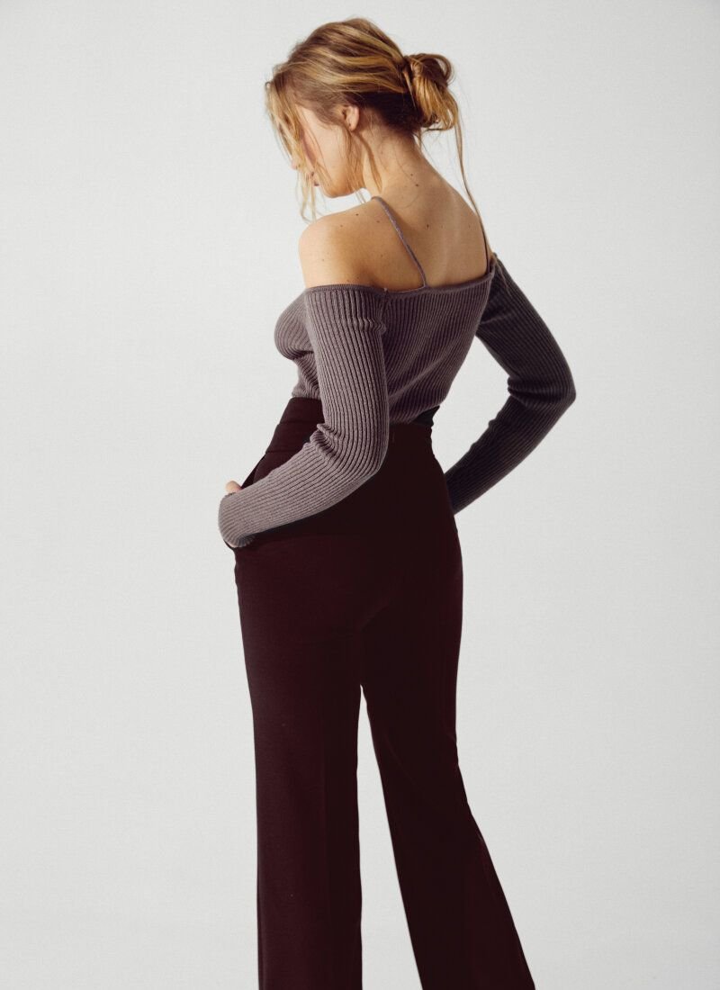The coffee-colored top supports the trend for knitted models, in the spirit of FW'2020/2021 Fendi and Herm?s. The form-fitting cut was complemented by an open shoulder line with thin straps.