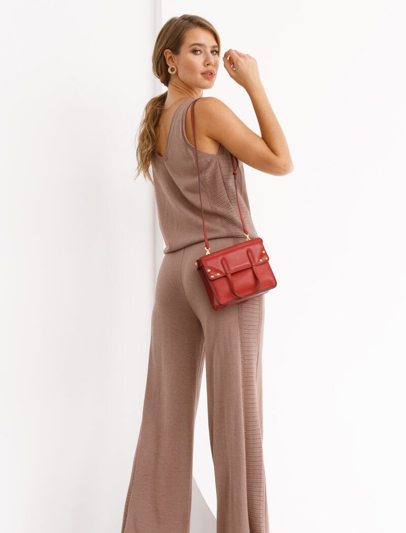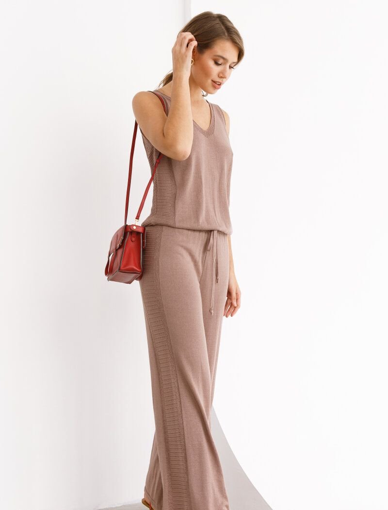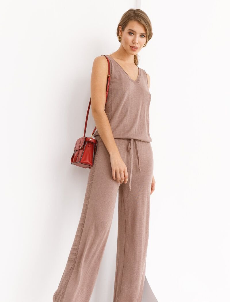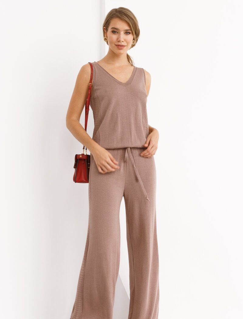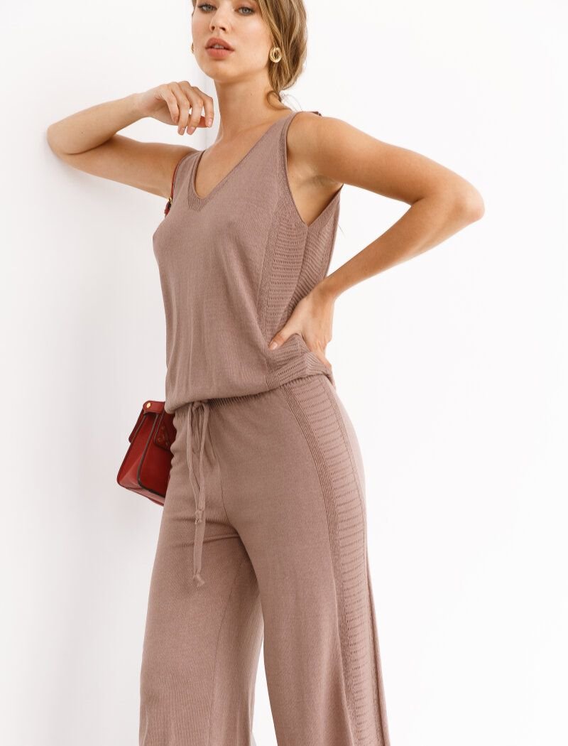 Knitted trousers of a loose-fitting cappuccino shade with an elastic insert with ties at the waist.