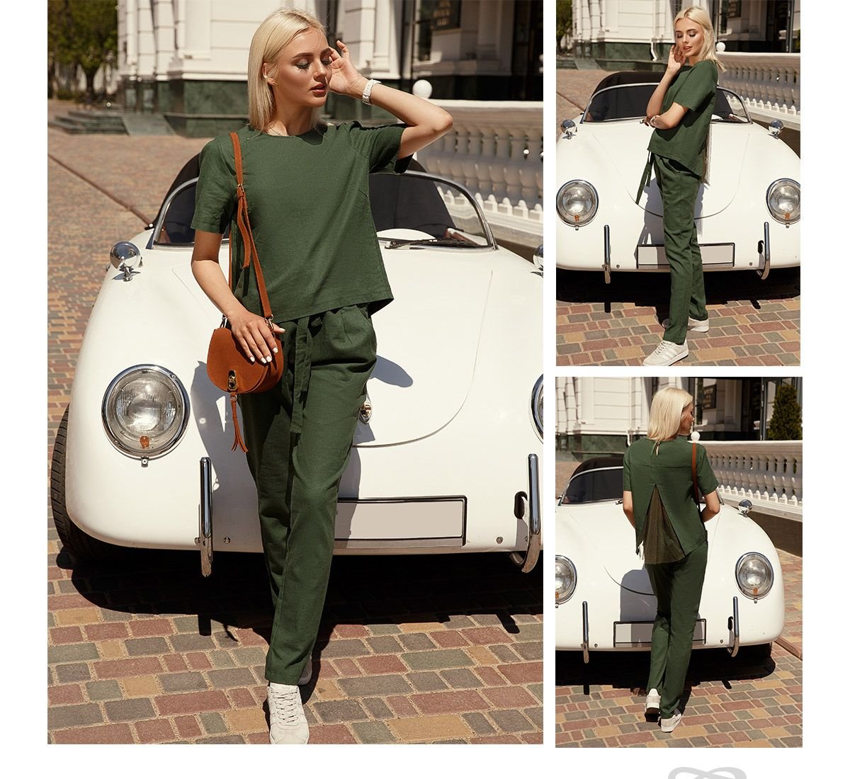 Summer suit made of linen fabric: a loose top with short sleeves and a mesh insert on the back, medium-fit trousers with a fixed lapel, elastic waistband, welt pockets and drawstring ties.