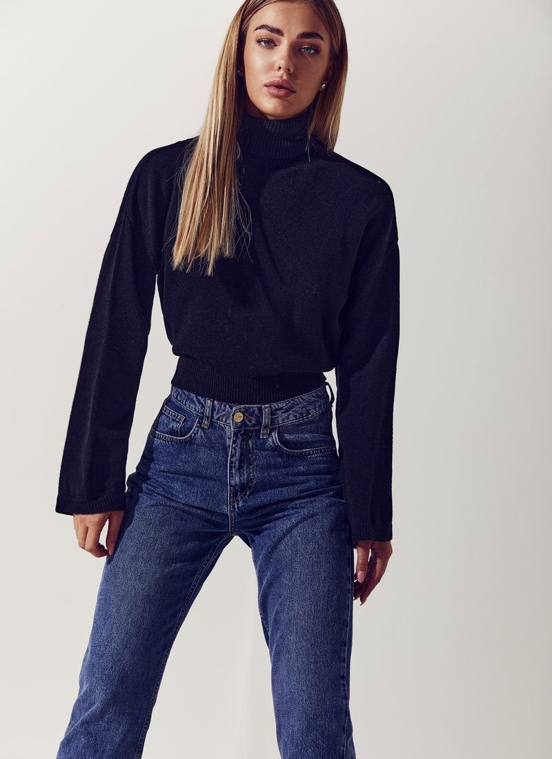 The black jumper is made of soft jersey. The model is stylized with wide straight sleeves, a stand-up collar, an open back with a drawstring at the back.