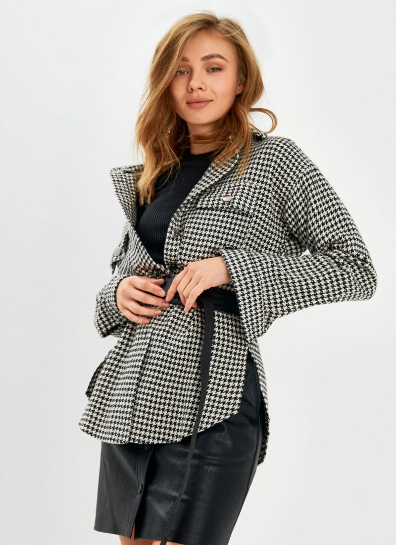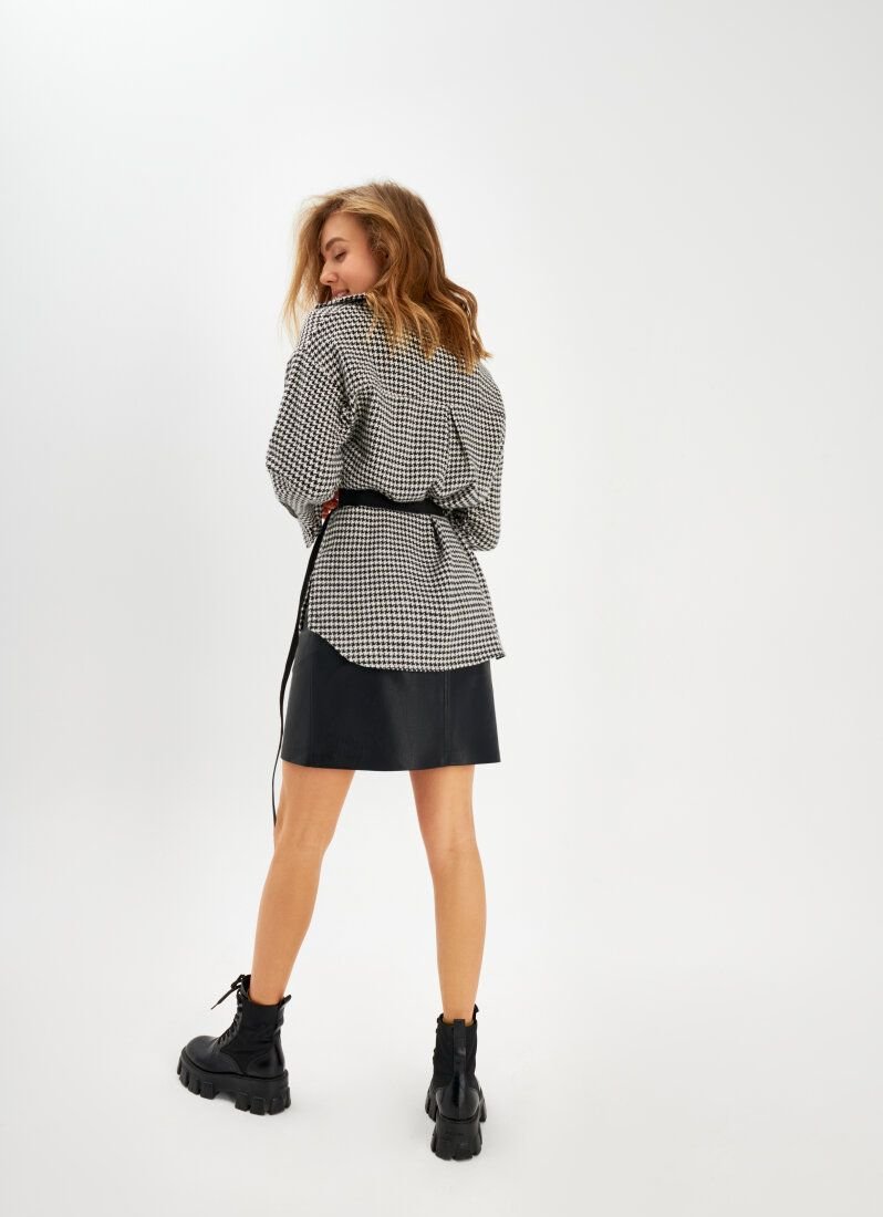 The shirt is made of dense textured fabric with a "crow's foot" print. The oversize cut, as on the models from the SS'21 Fendi and Balenciaga shows, was supplemented with an asymmetric bottom edge with side slits. A textile belt with a fastex fastener allows you to make the silhouette fitted.