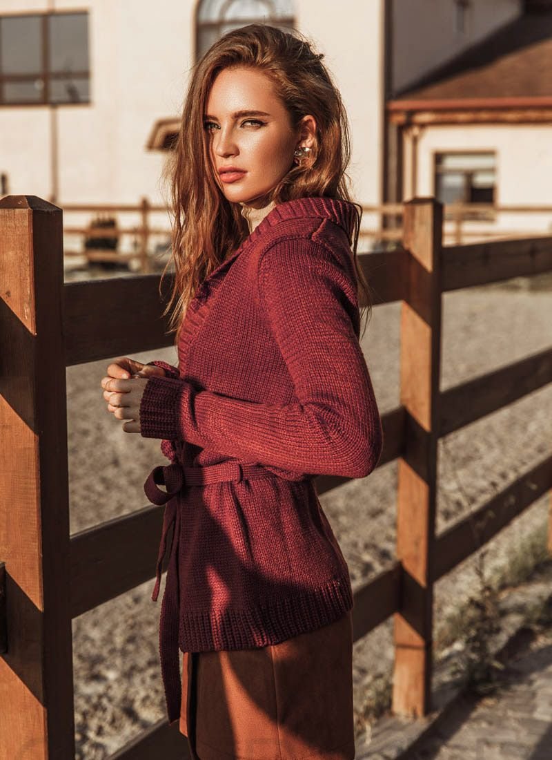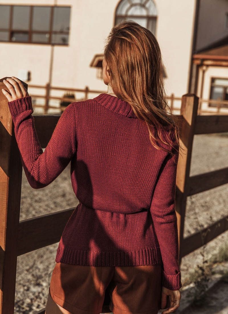 A soft dark red cardigan with a turn-down collar, v-neck and a removable belt with loops.