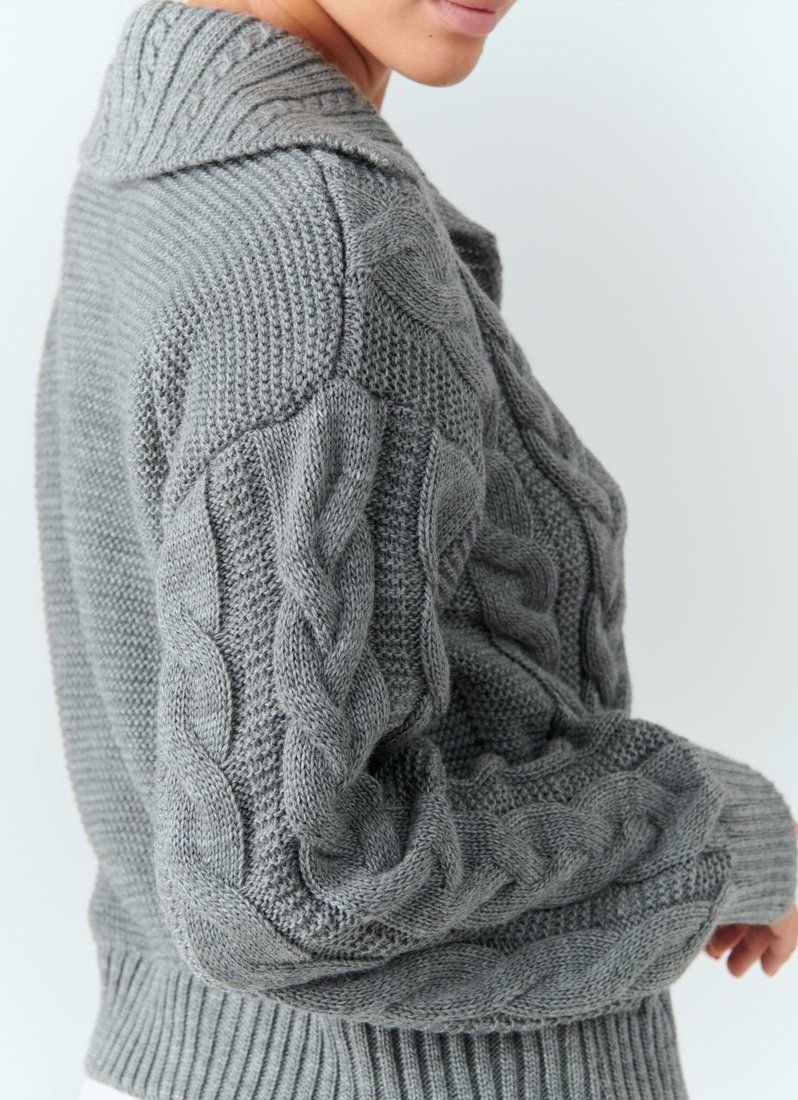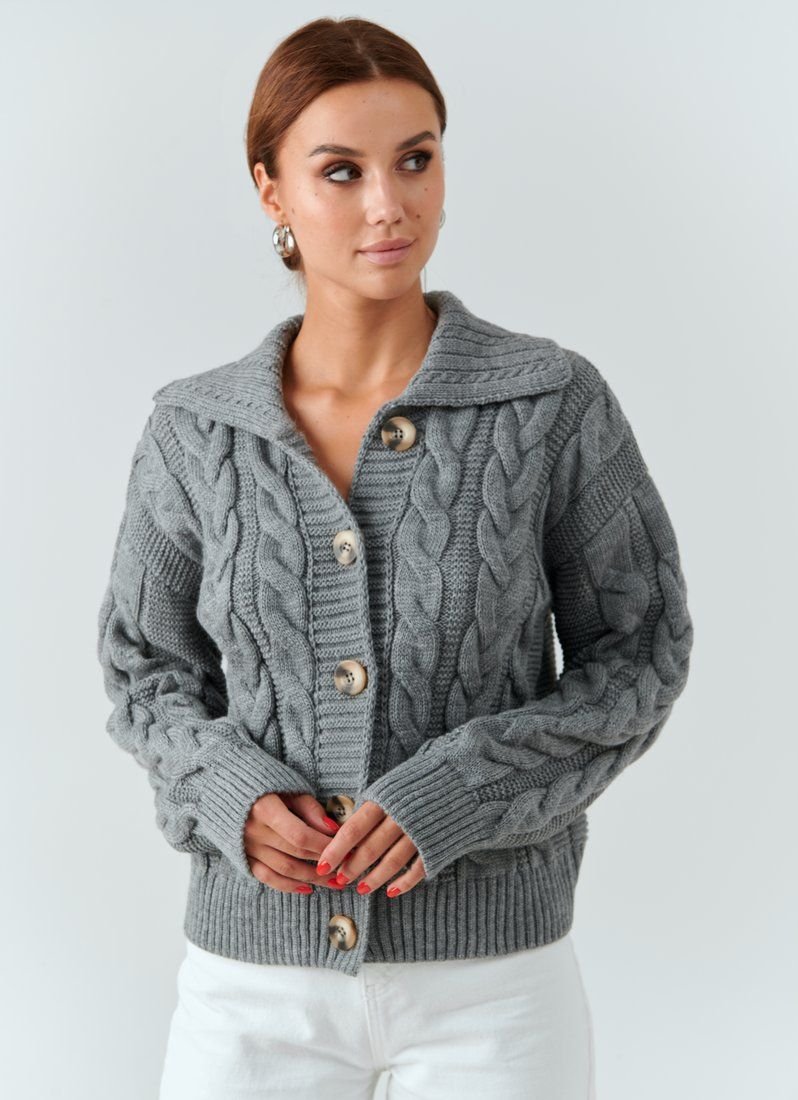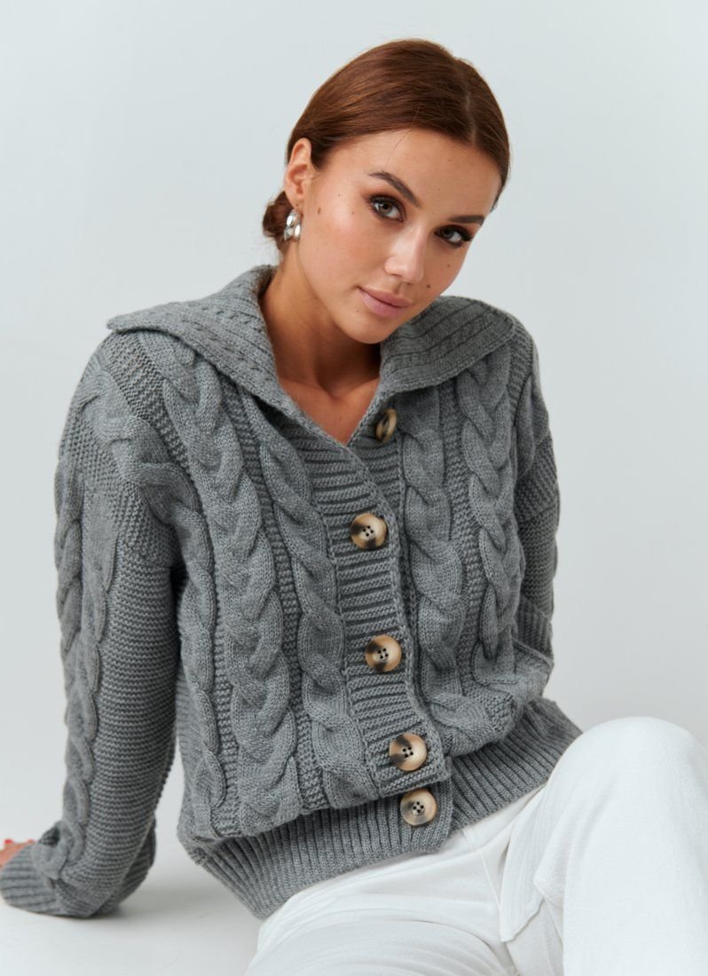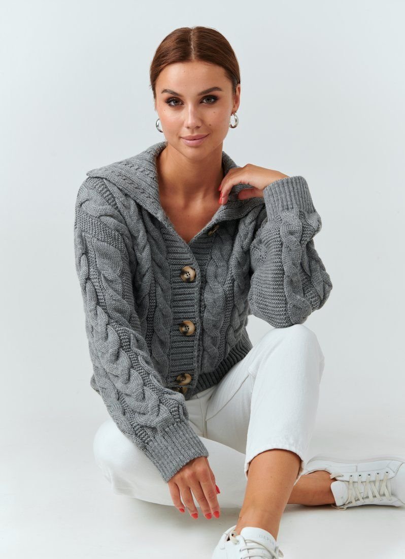 Grey wool jumper with buttons. The jumper is decorated with a knitted pigtail, as well as a large collar. This model can be worn as an independent thing, or over tops or shirts.