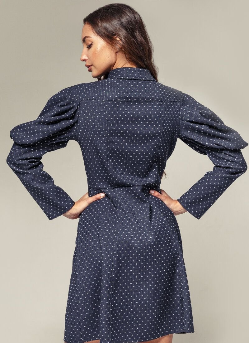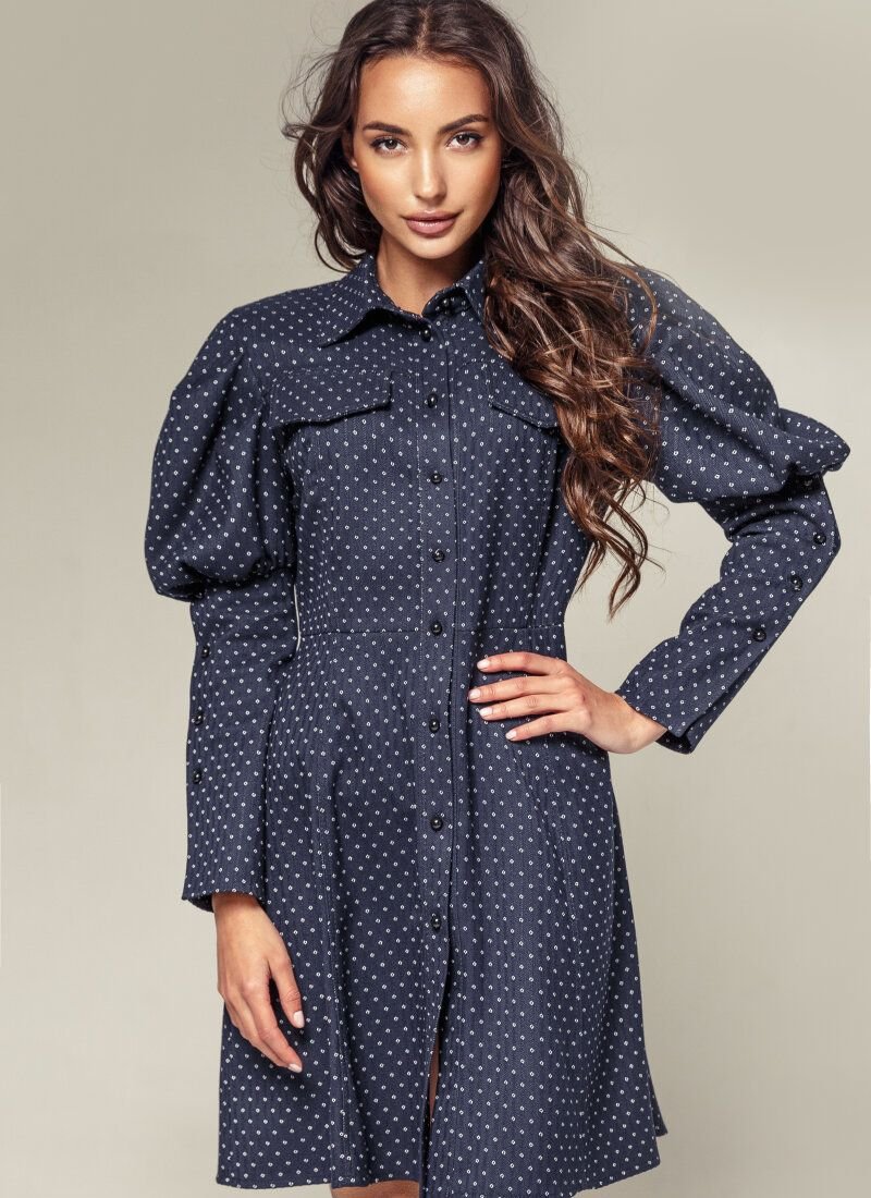 A blue dress with a minimalist geometric print embodies one of the trends of FW 20/21: voluminous sleeves on wide cuffs in the spirit of old images. The model was supplemented with a turn-down collar and overhead valves on the chest.