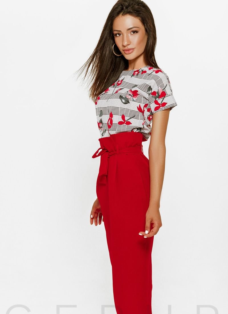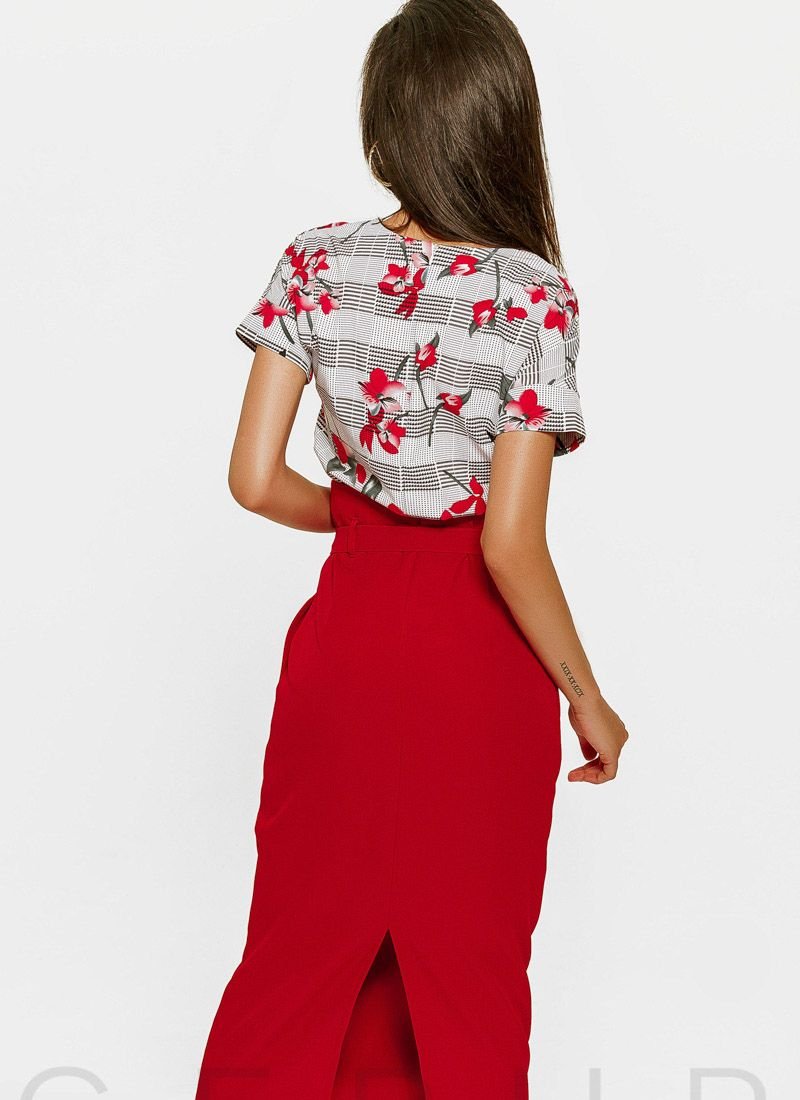 Stylish women's suit: a loose-cut striped blouse, a one-piece sleeve with a fixed cuff and a classic round neck, a skirt made of soft fabric with an inflated waistline, pinches, a belt in loops and a high slit at the back. ...