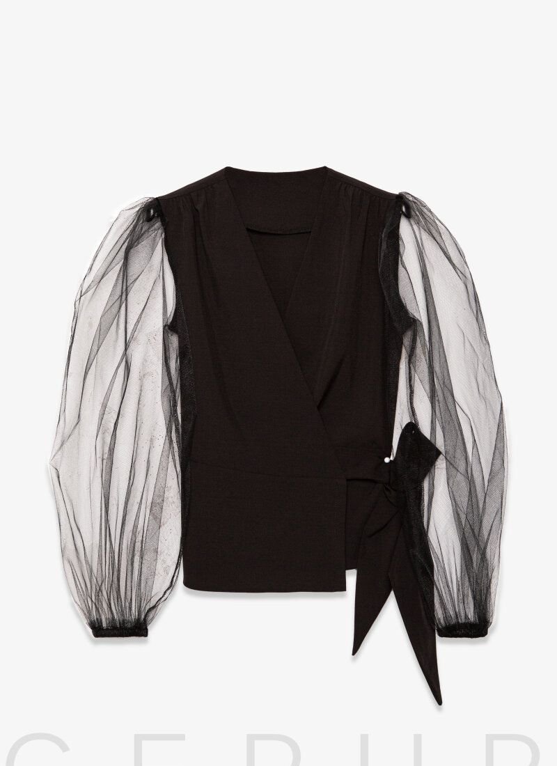 Blouse of restrained black color for the smell. Fitted cut. Deep v-neck, voluminous sleeves made of airy mesh fabric on an elastic cuff.