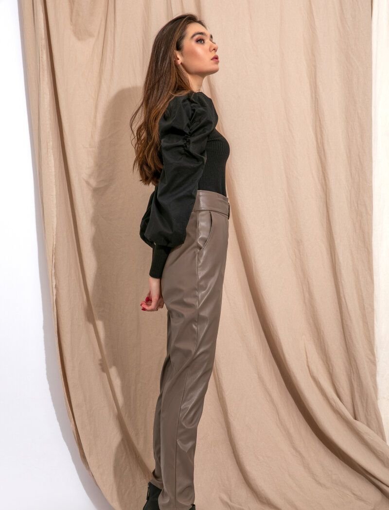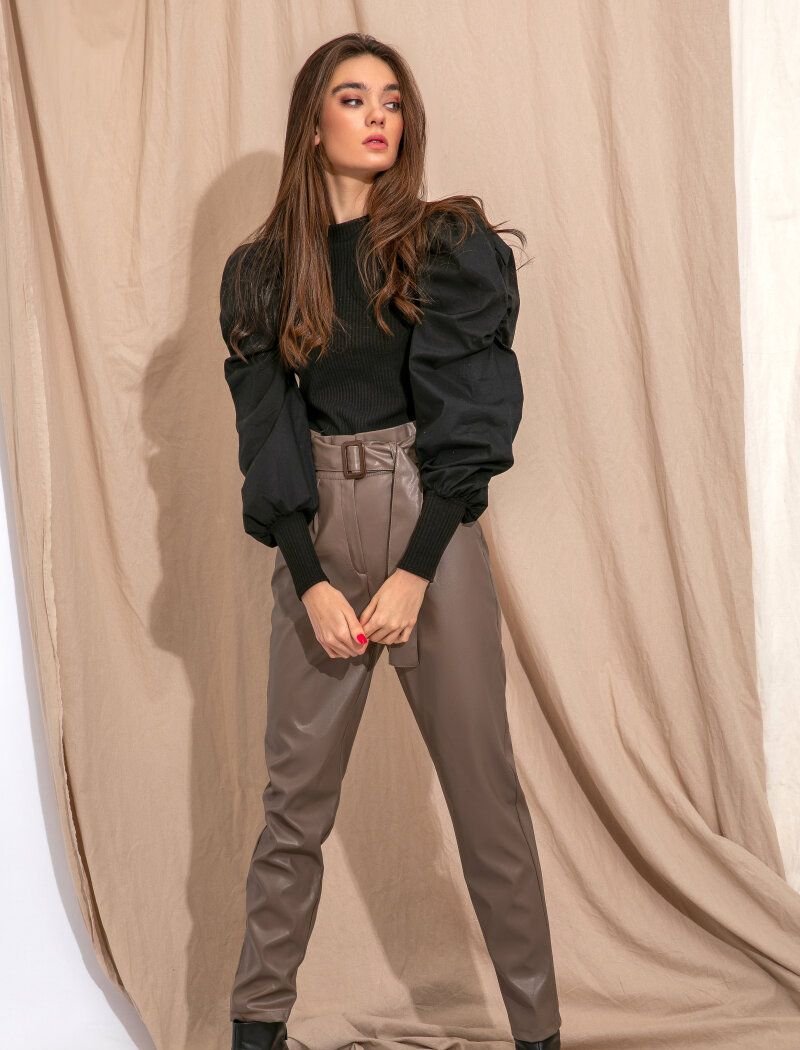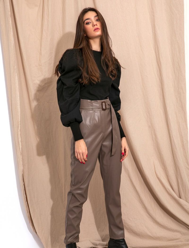 Trendy trousers made of eco-leather: an inflated waistline, a classic, narrowed down, cut, a plain belt in loops and two welt pockets on the sides.