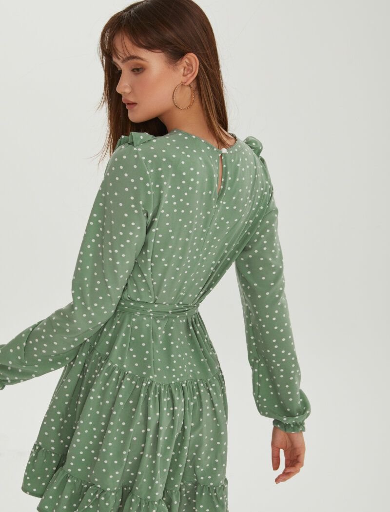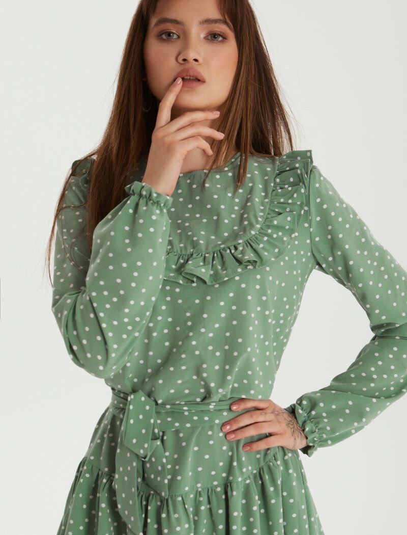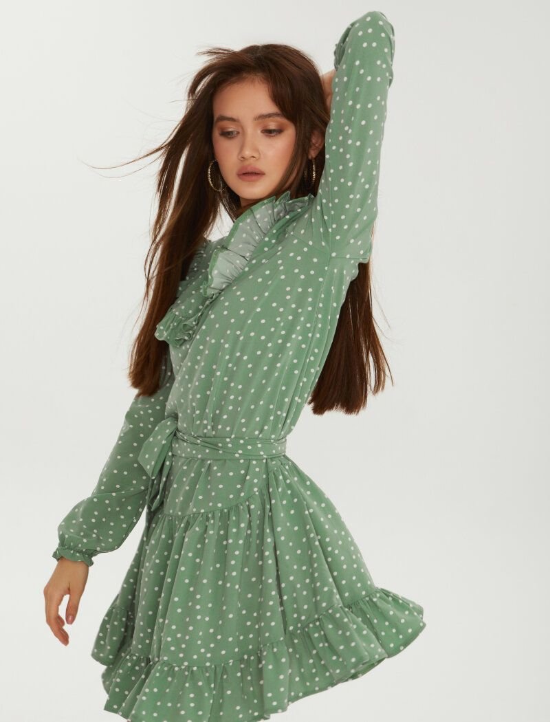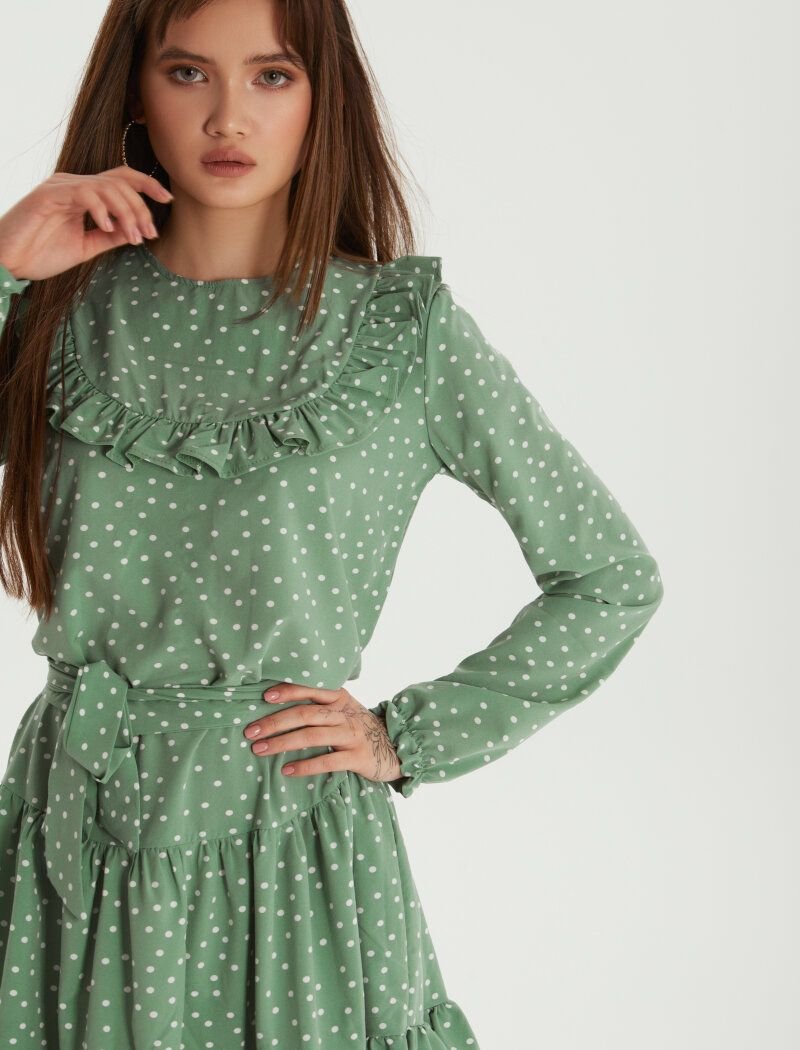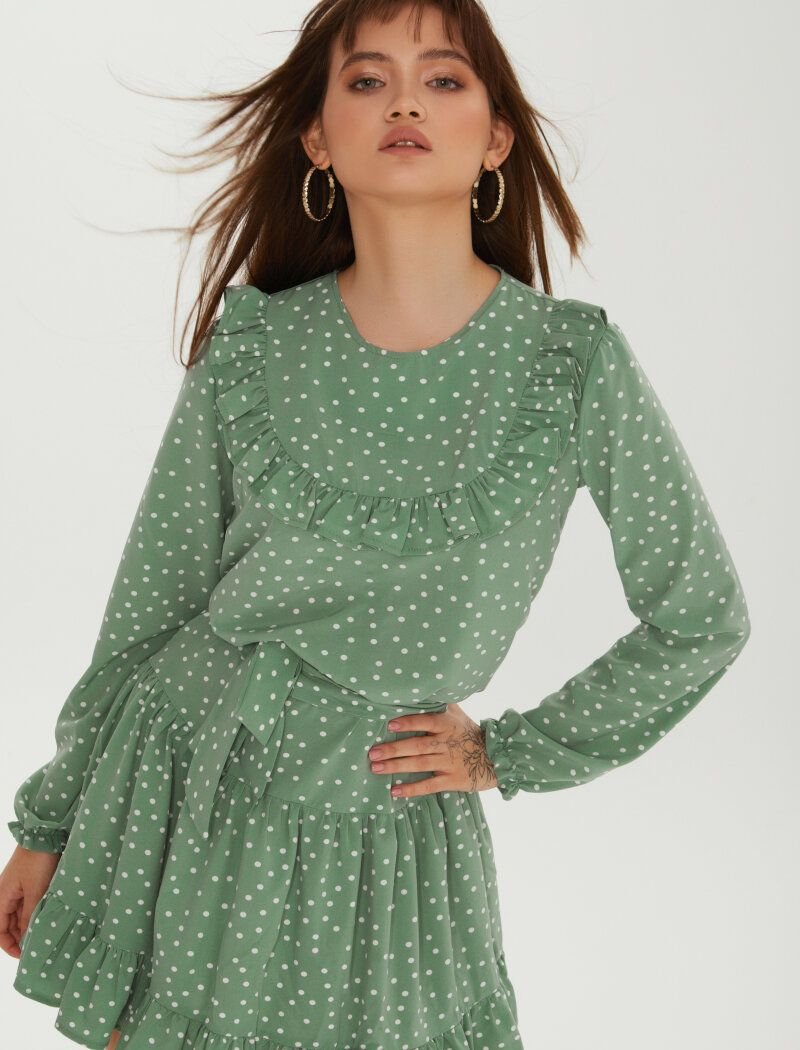 A short dress in an elegant pea print. Loose fit. Round neck, long sleeve with elastic cuff. Ruffles on the chest, a removable belt to match and air flounces on the skirt.