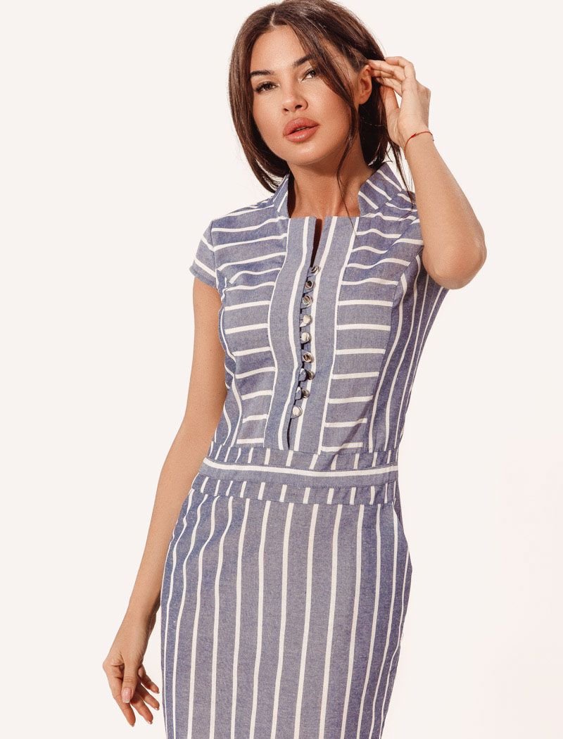 A fitted dress in a striped print: a round neck with a stand-up collar, wing sleeves, a placket with metallic buttons, a sewn-in belt and a straight short skirt with two welt pockets on the sides.