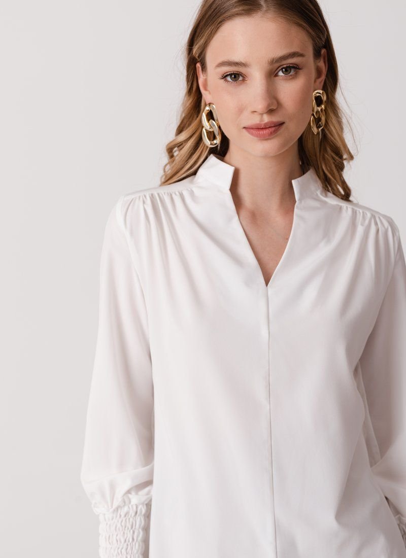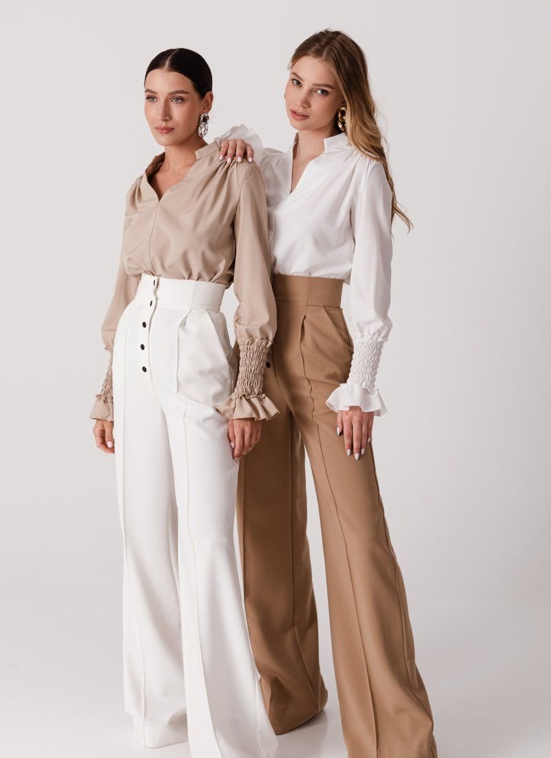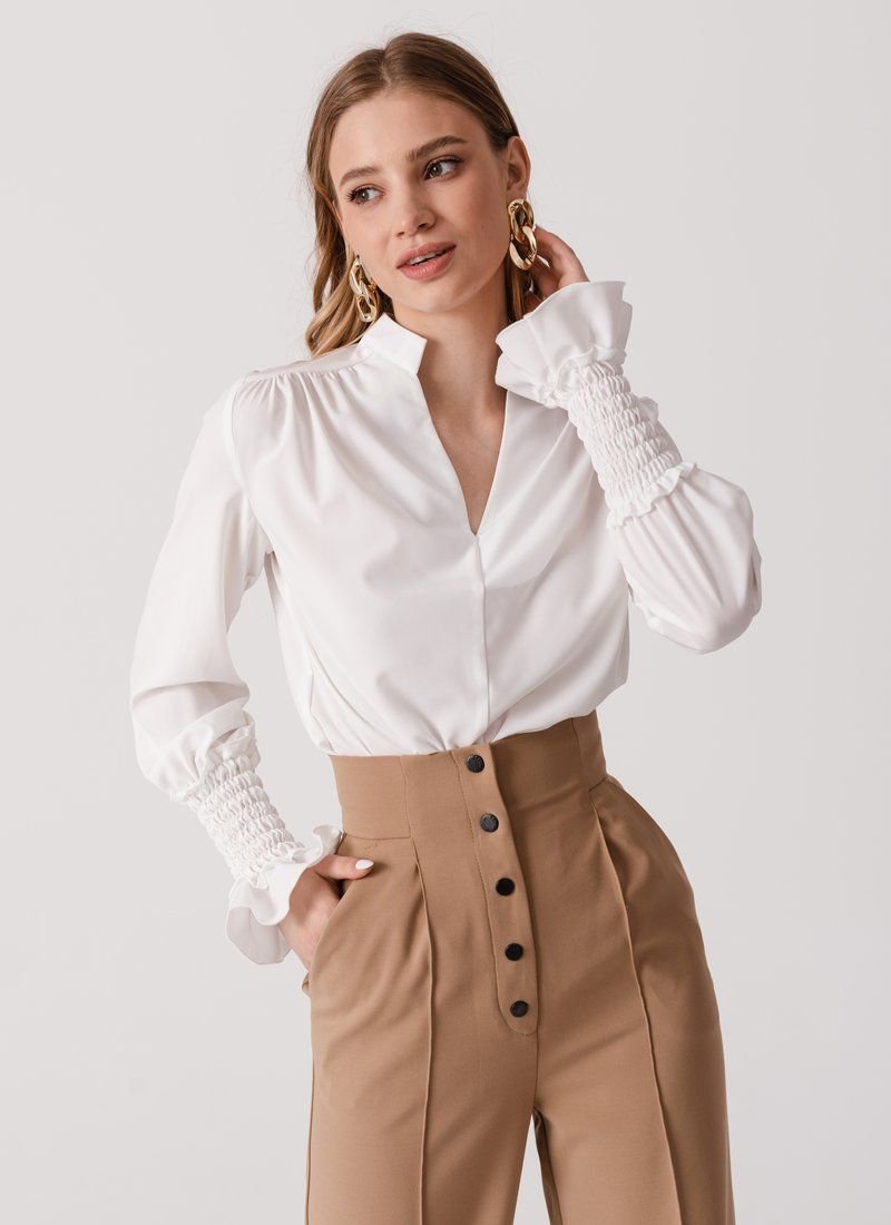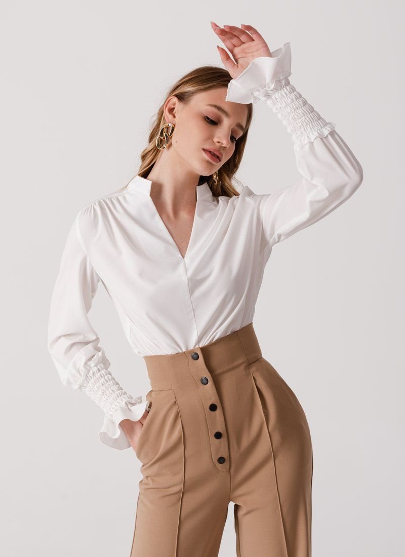 A loose white blouse with a stand-up collar refers to the Victorian style, which is included in the list of current trends of SS'21. For sewing a model with a V-neck, visually lengthening the neck, and draperies on the sleeves, a pleasant and light material was used.
