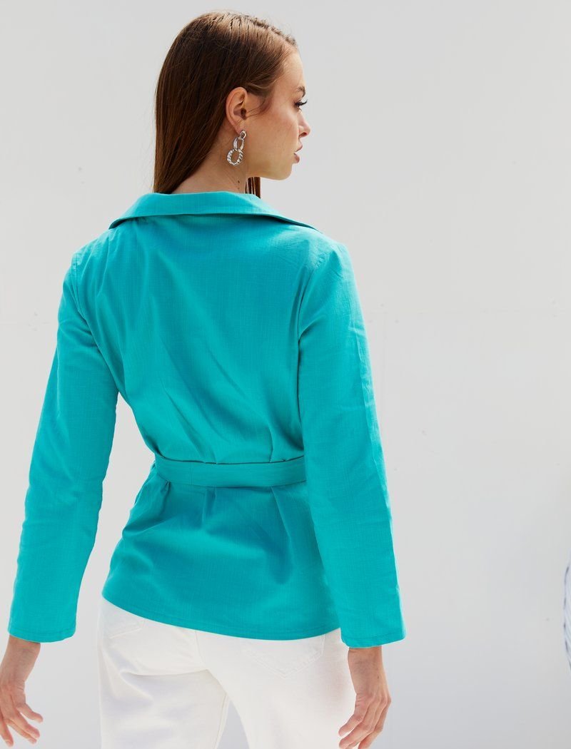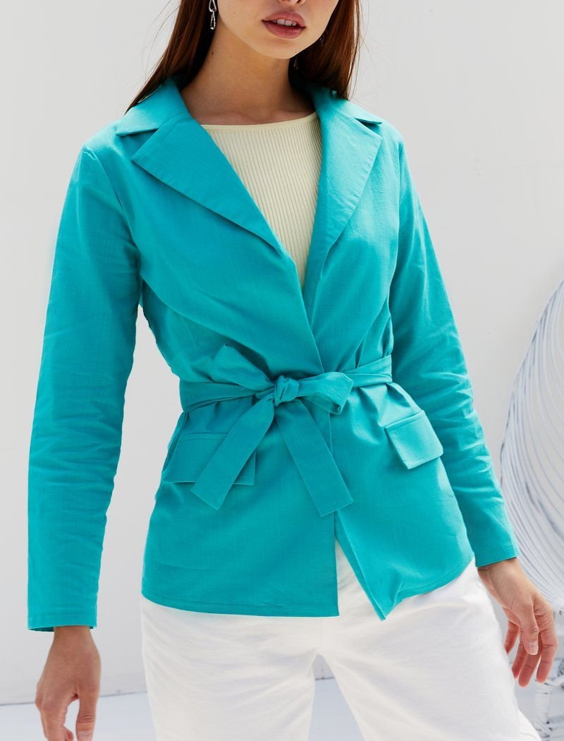 A jacket made of light fabric allows you to add an element of classics to your summer wardrobe. The #008000 model is made of mixed linen|which does not float. The absence of a clasp and a belt-ribbon add relaxation to the image.