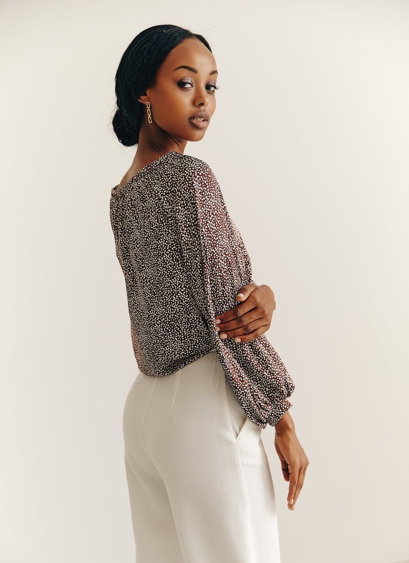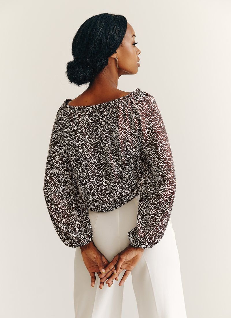 A chocolate-colored silk blouse with small white polka dots, with a boat neckline and an elastic insert on the back. Buttons on the front, long loose sleeve with thin cuffs.