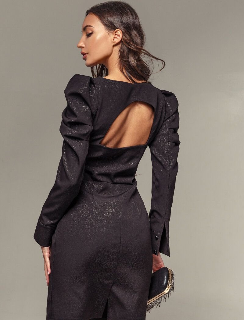Black color and curly cutouts: on the chest and back, voluminous sleeves with pinches on the shoulders form a refined silhouette of the dance. The sew-in belt emphasizes the waistline. The model was made of a material with a minimalistic geometric texture. The cocktail ensemble can be supported by dark stiletto shoes and a matching clutch.