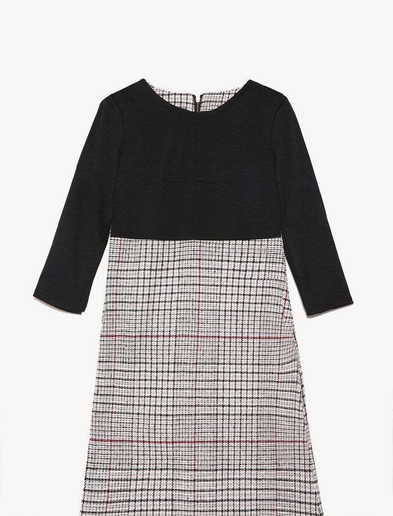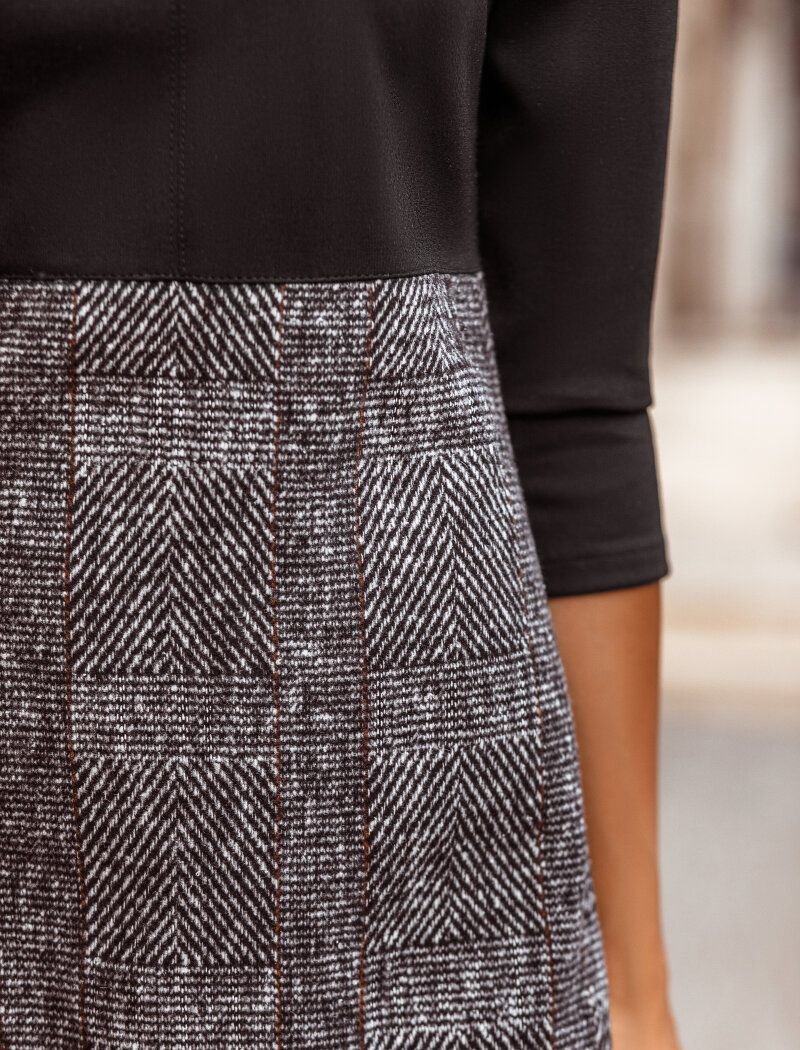 Two-tone elegant dress with a flared cut with an inflated waistline, a laconic yoke and a tight 3/4 sleeve made of contrasting knitted fabric. Please note that the checkered print may differ (see the additional photo).
