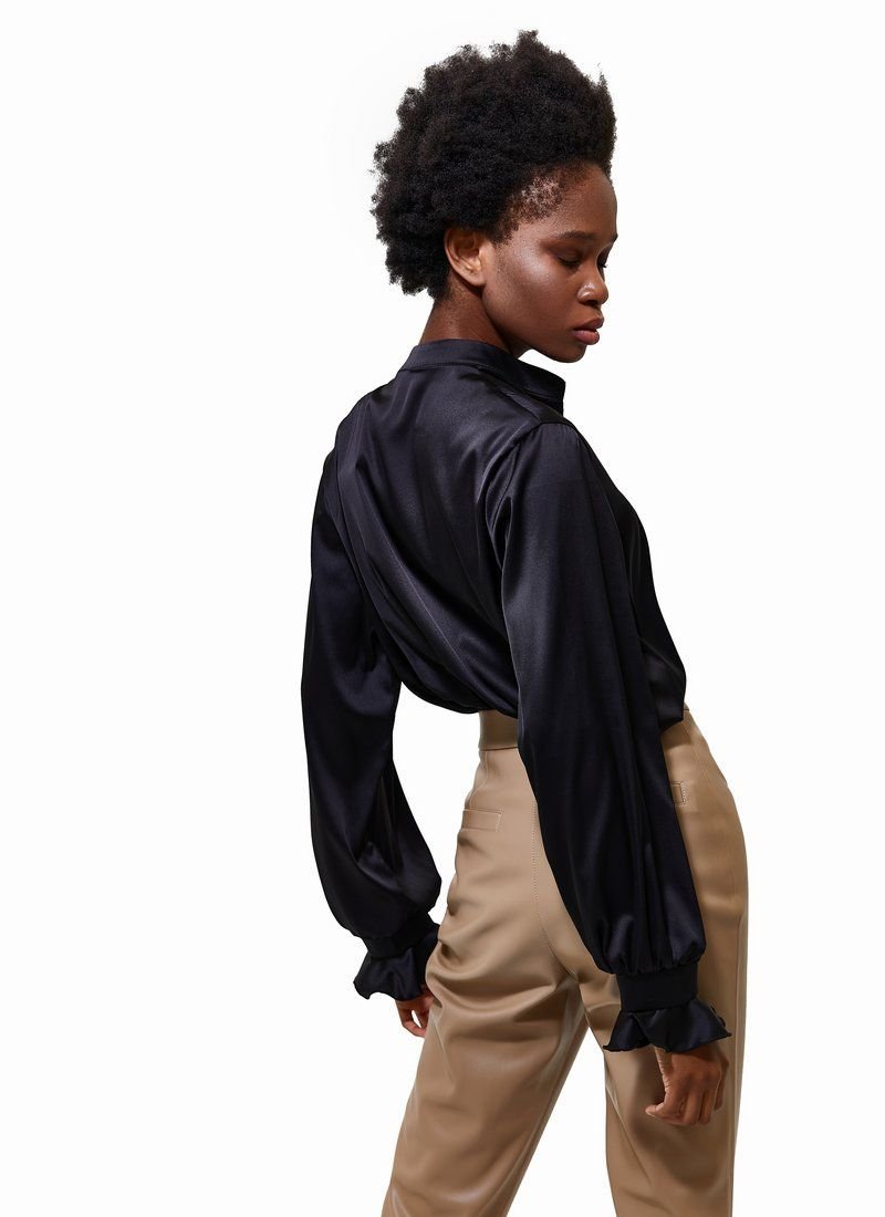 Black silk blouse with long sleeves, turn-down collar. This model will add a classic look to your image. The blouse looks great with both trousers and jeans.
