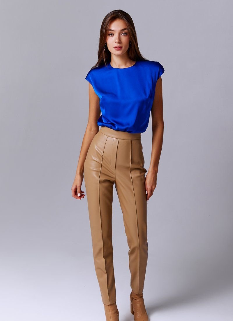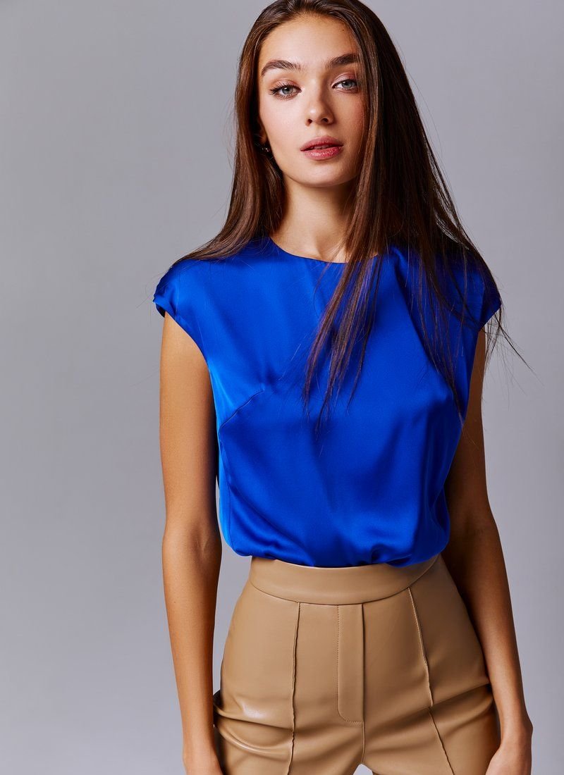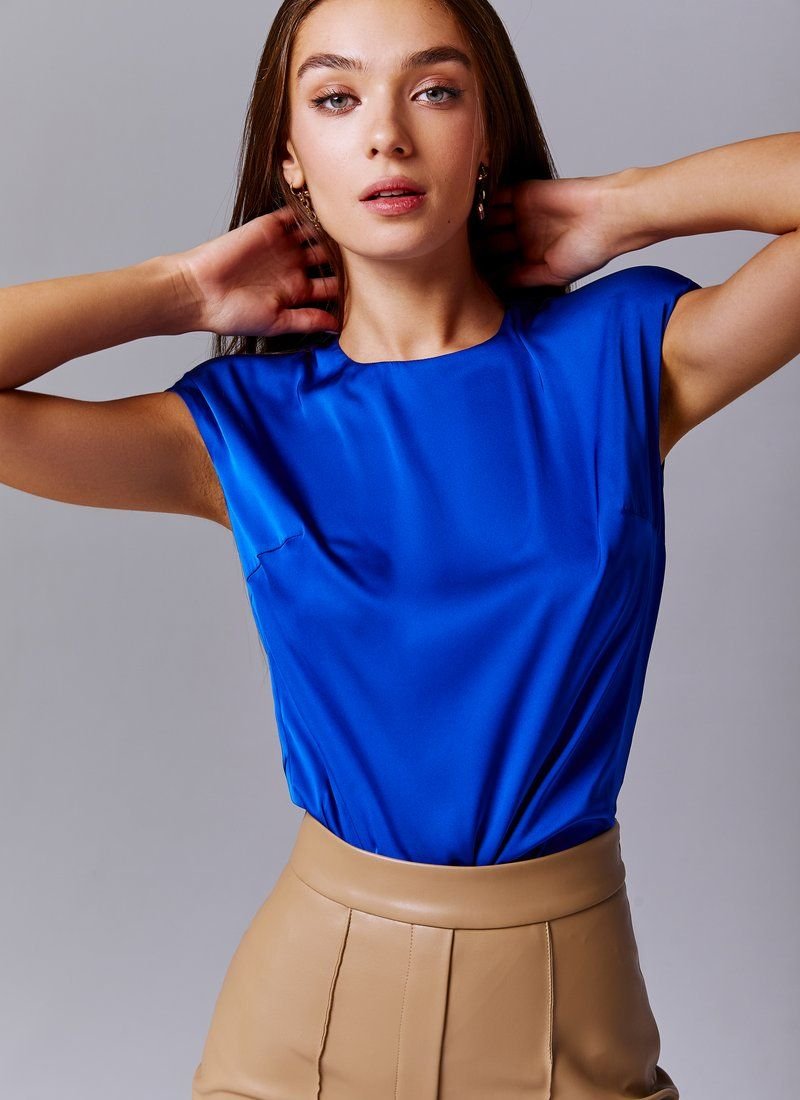 The blue top from the new Gepur 2021 collection will become a universal element in the wardrobe. Thin silk was used to make a laconic model with short sleeves and a round neck. Its soft shine supports the trend for satin models in the spirit of Gucci and MSGM. The shoulder line was emphasized with foam shoulders.
