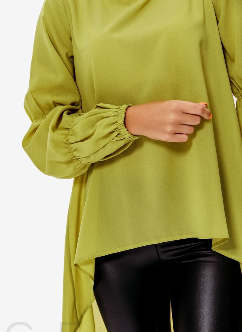 Light casual suit: asymmetric chiffon tunic-oversize with a long spectacular sleeve on an elastic cuff and an elongated back, leggings made of eco-leather with a narrow cut and an elastic insert on the waist.