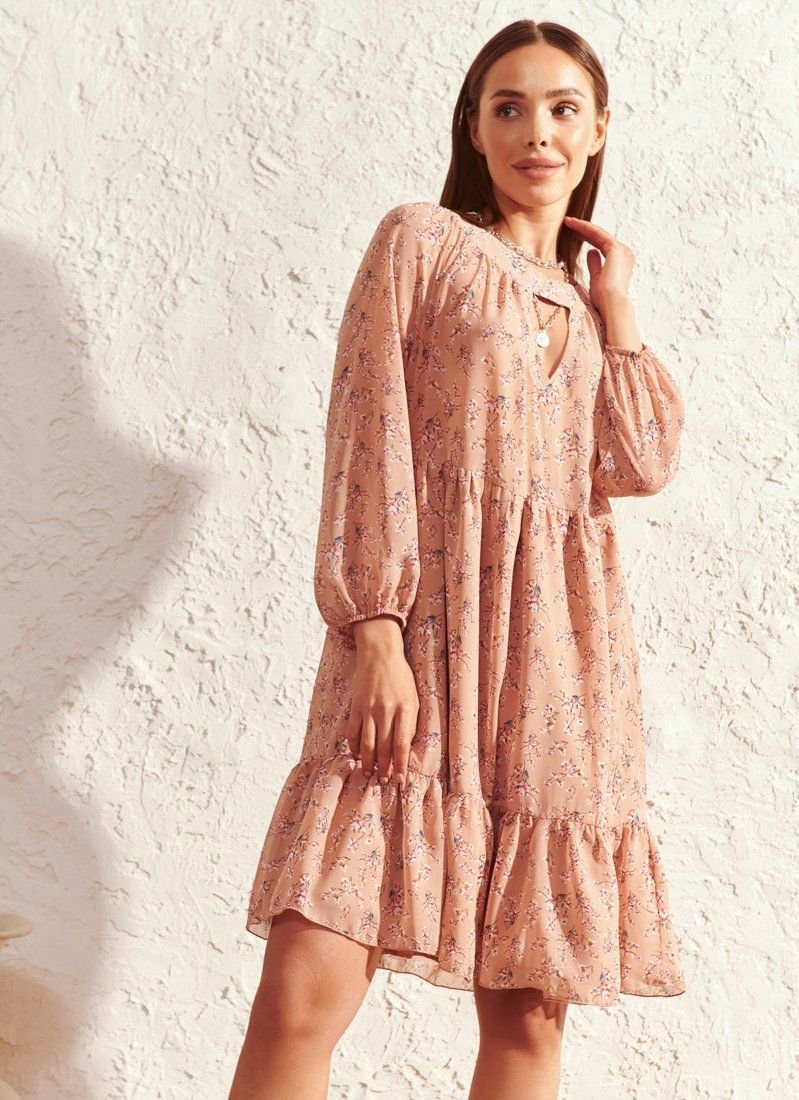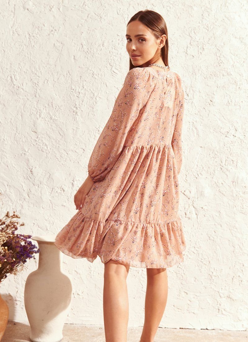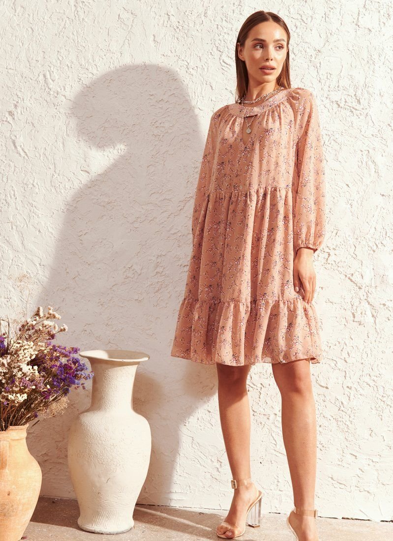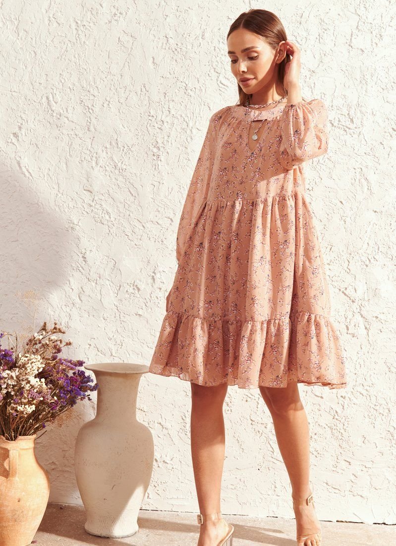 The powdery dress has acquired a new sound due to the material and floral print included in the list of fashion trends of the SS’21 season according to Vogue. Light chiffon was used for sewing the model. The romantic mood of the pattern and the lightness of the fabric were enhanced by a loose cut and a flounce at the hem. The decollete area was accentuated with a teardrop-shaped neckline.
