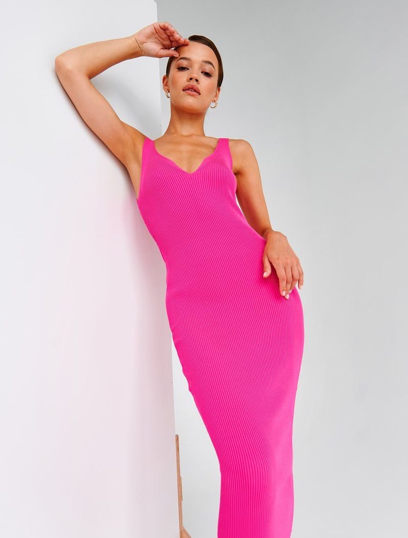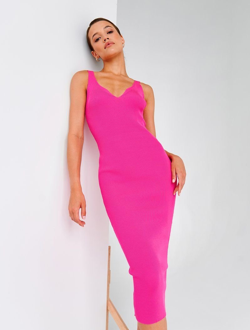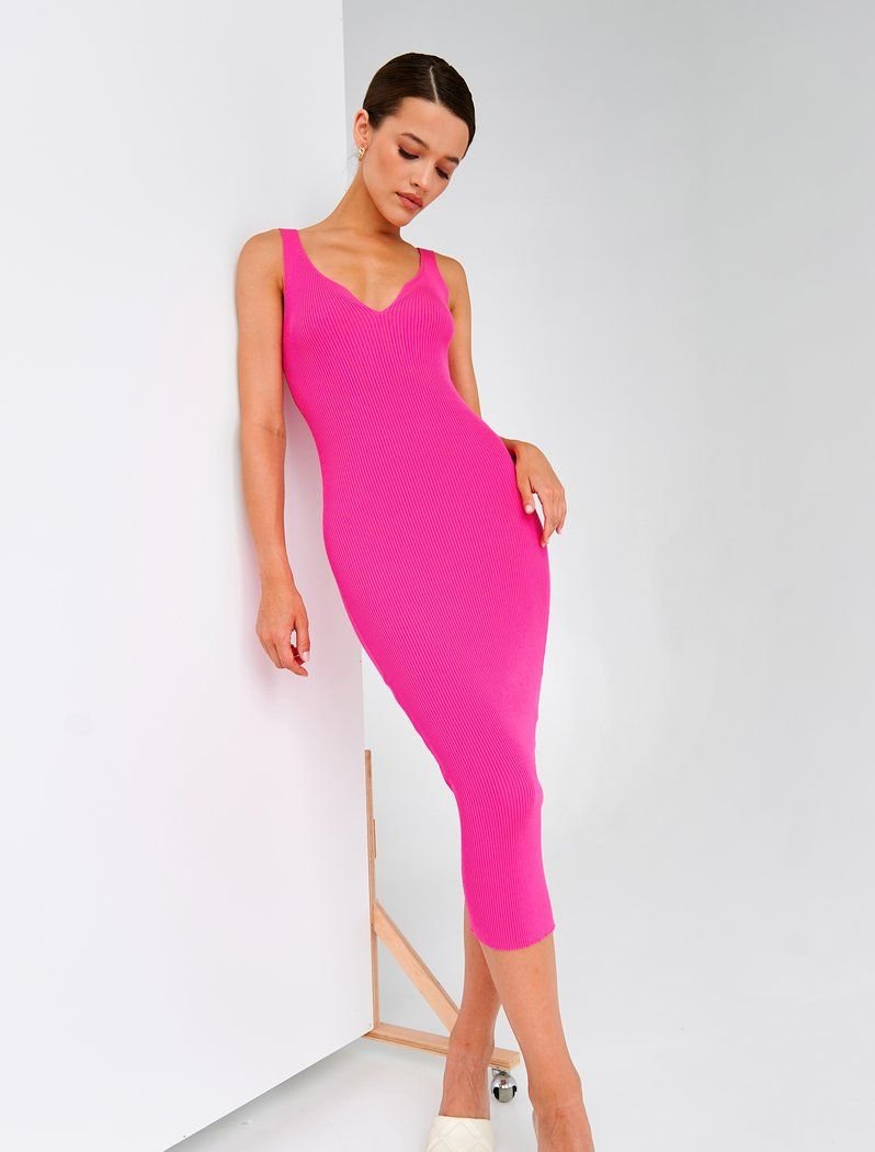 A delicate crimson midi dress with a v - neck on wide straps. It will beautifully emphasize your figure and will be an excellent choice for both a casual image and an evening out.