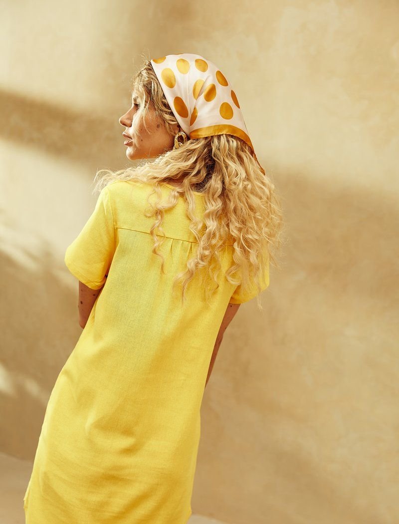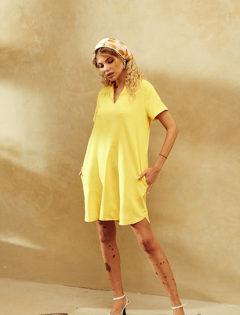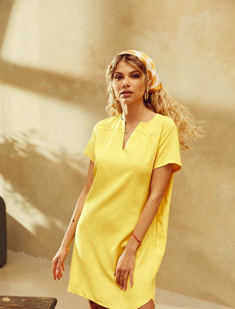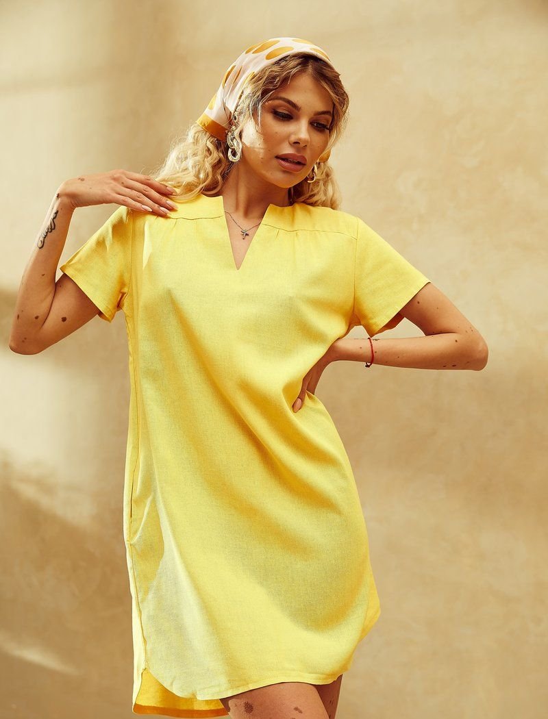 Laconic summer dress made of linen. A small v-neck on the chest, a short sleeve and a flared skirt with two pockets in the seams and a rounded hem. The model will become a worthy basic element for creating a bright summer image.