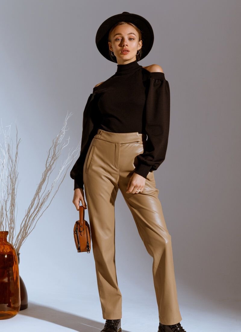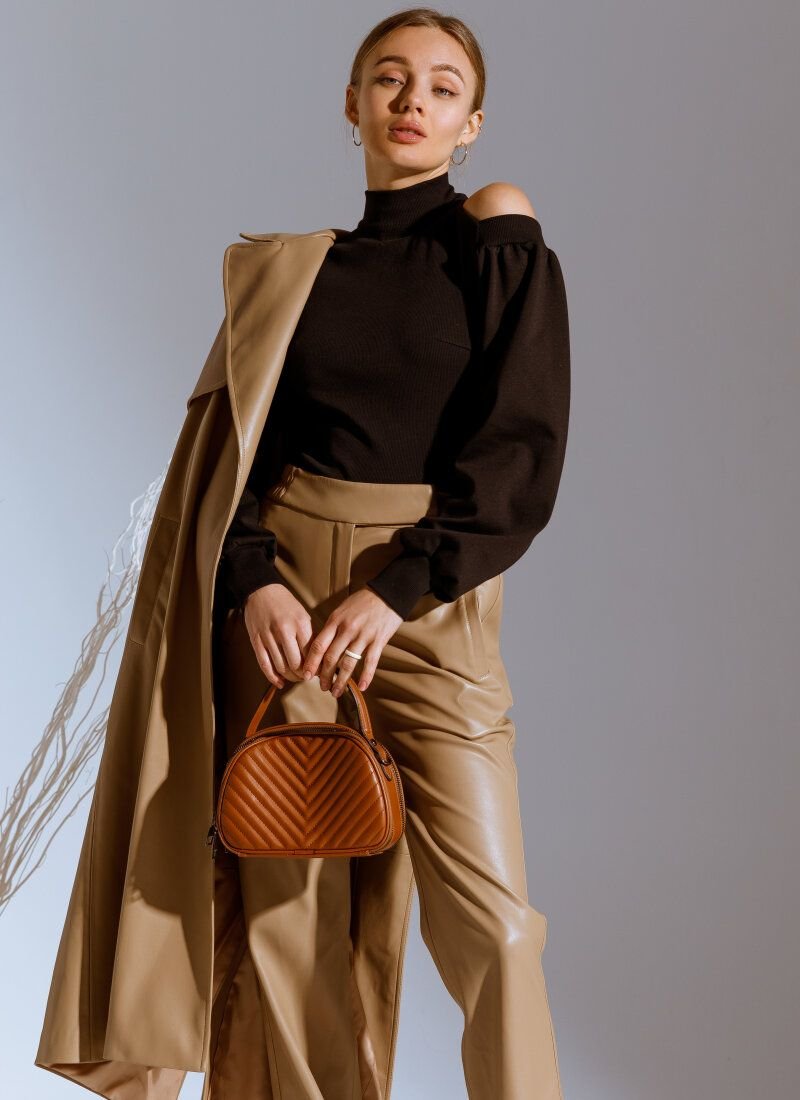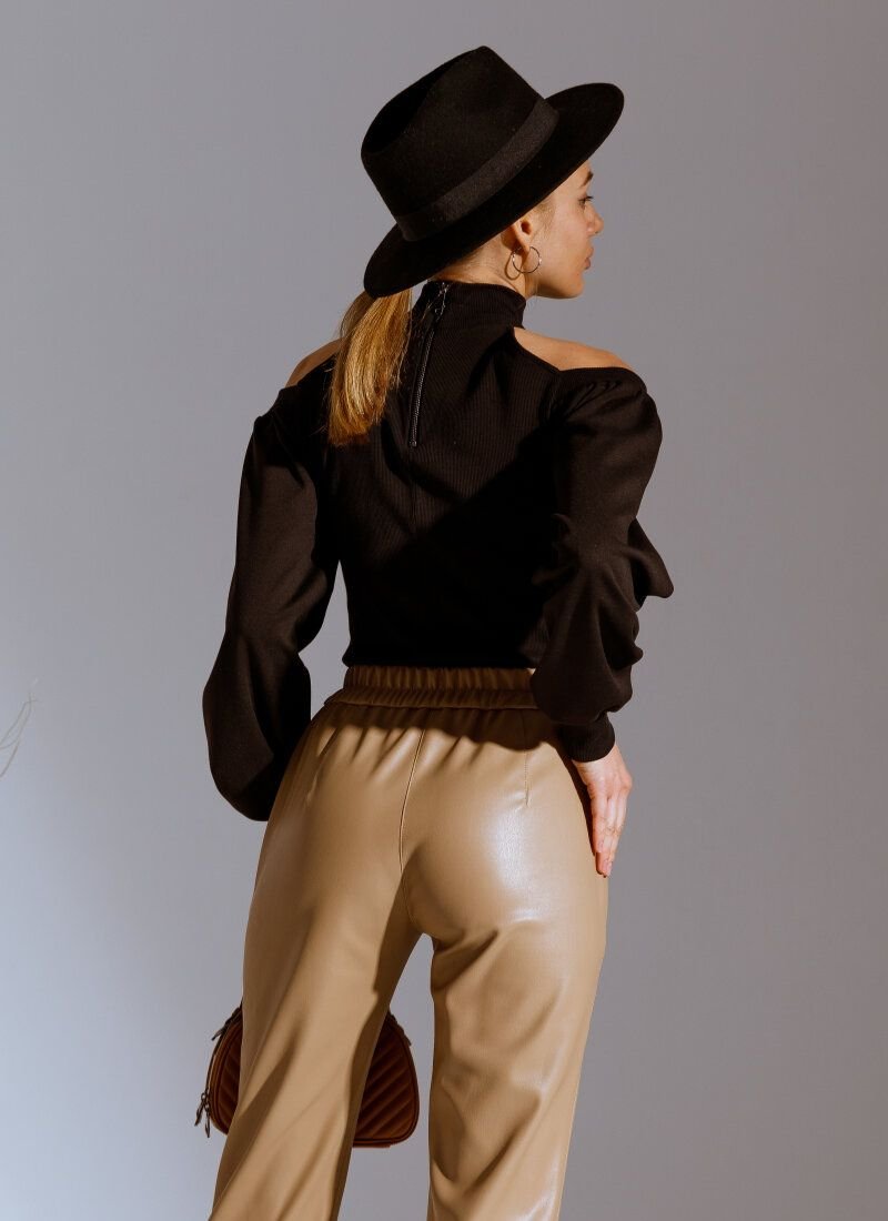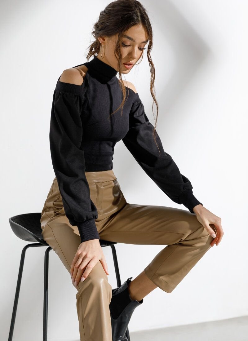The basic black turtleneck will support the current trend for knitted models in the spirit of the Fendi and Hermès brands of the SS’21 season. The model combines two types of materials: a ribbed base and voluminous sleeves made of smooth fabric. The expressiveness of the product was given by open shoulders.