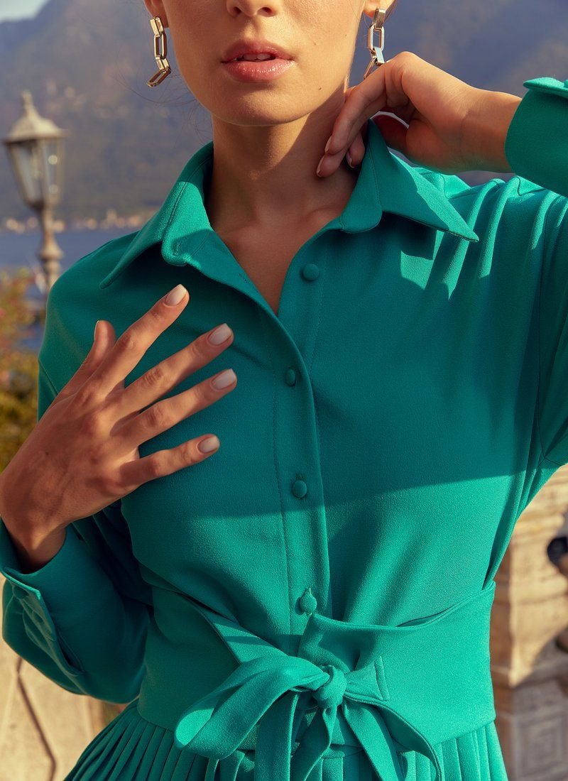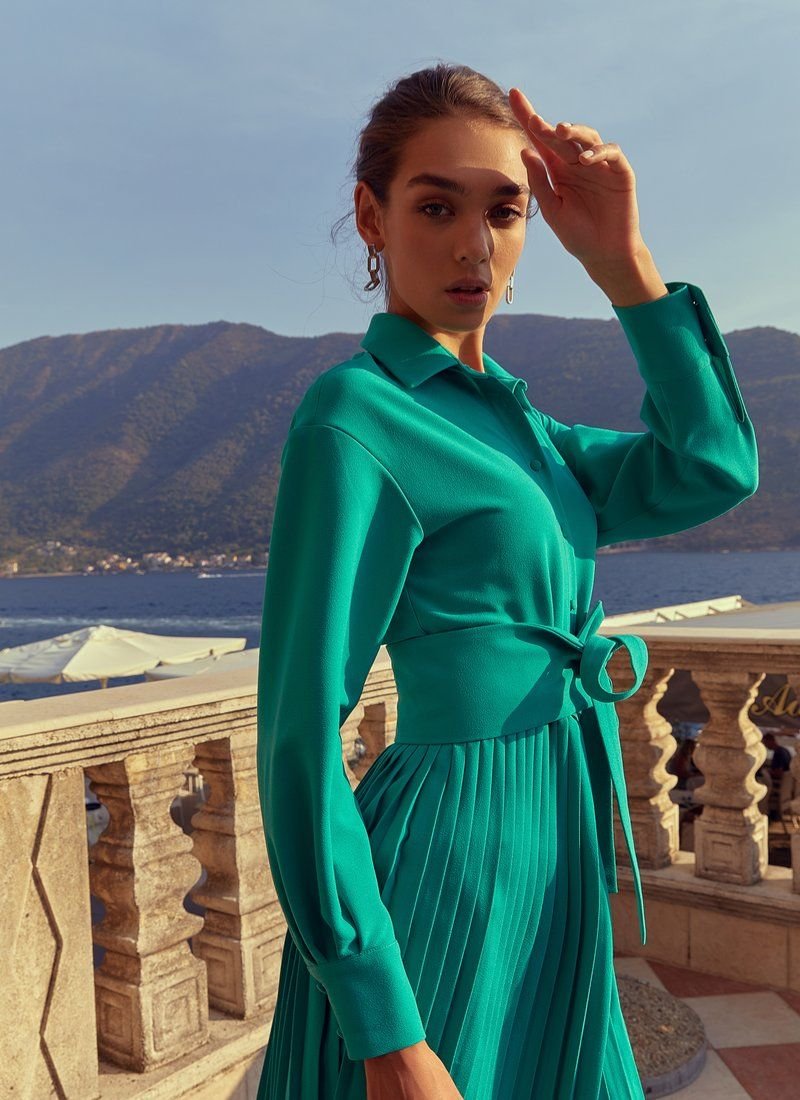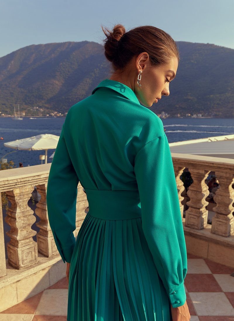 Green mini dress with long sleeves, loose fit. The waist is emphasized by a wide belt that comes with the kit. The dress comes with buttons on the front, with a pleated skirt. This model will be an excellent base for your wardrobe.