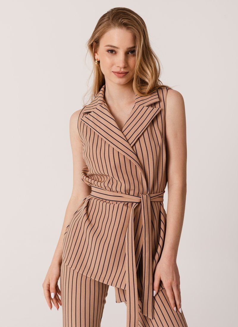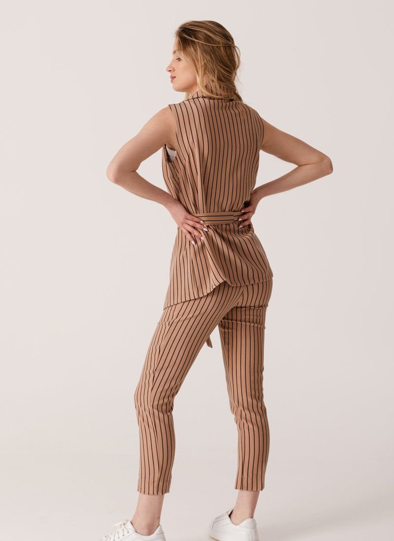 A striped print suit is a universal soldier in the wardrobe: the model will fit equally harmoniously into both office and casual attire. Soft and dense costume material was chosen for sewing models from cropped tight-fitting trousers and a jacket in a classic style. The waistline was formed with a belt-ribbon.