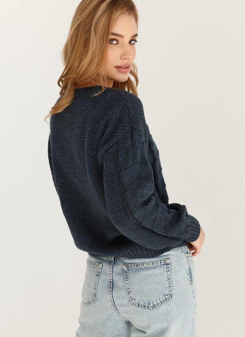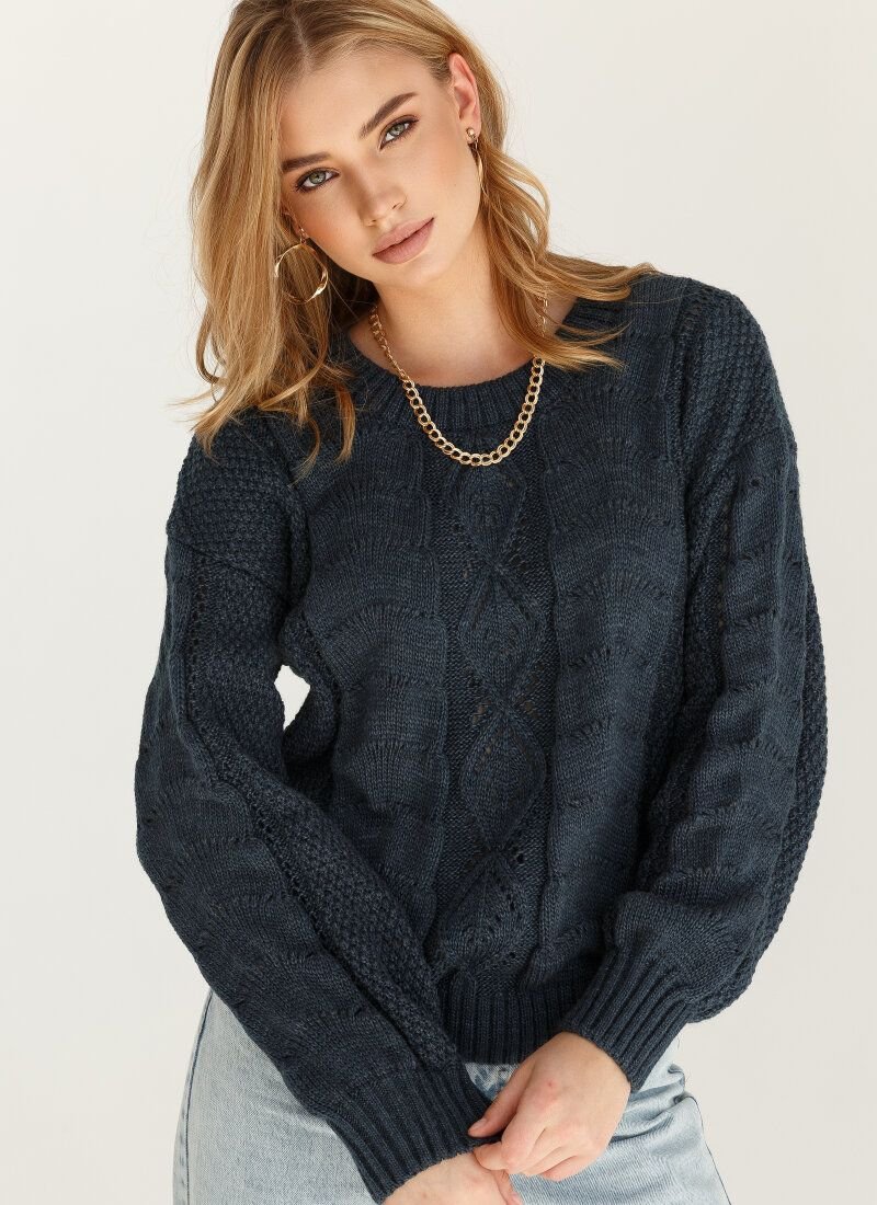 The jumper in a denim shade is made of a pleasant cotton material that retains heat well and envelops the body like a cloud. The model is decorated with a textured openwork pattern on the front and on the sleeves.