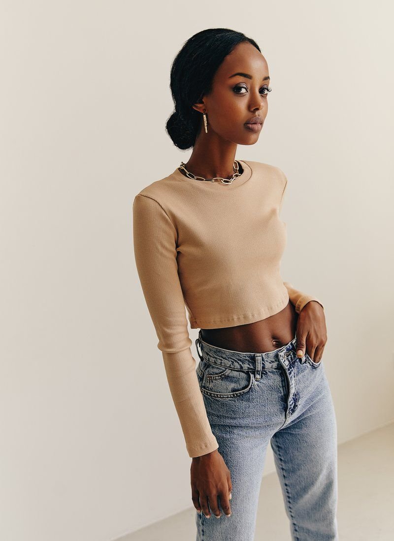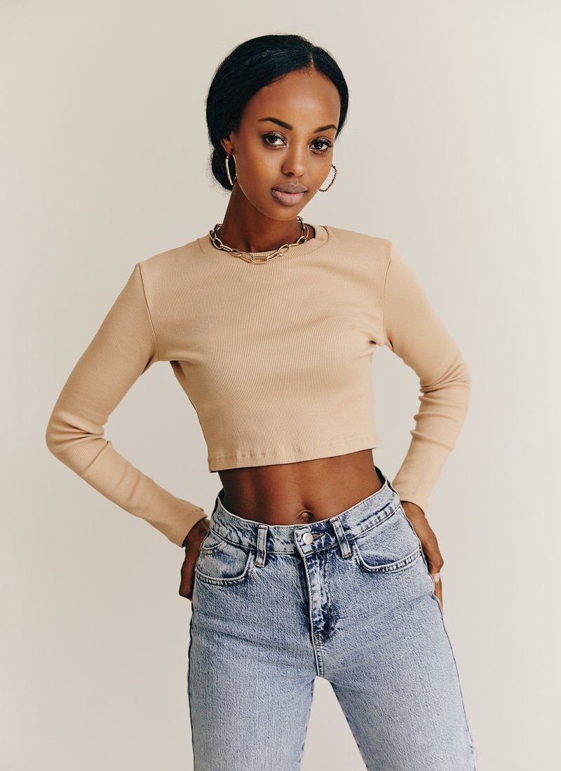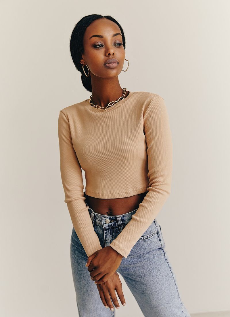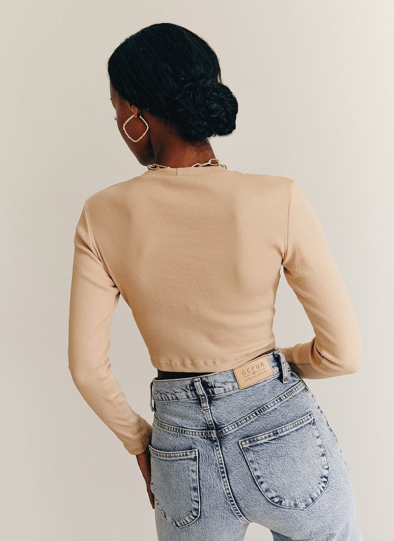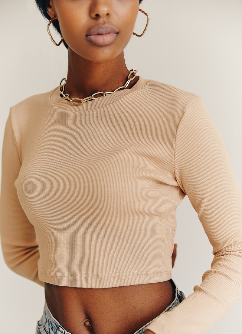 Cropped beige ribbed longsleeve with a round neck. Knitted fabric, long fitting sleeve.